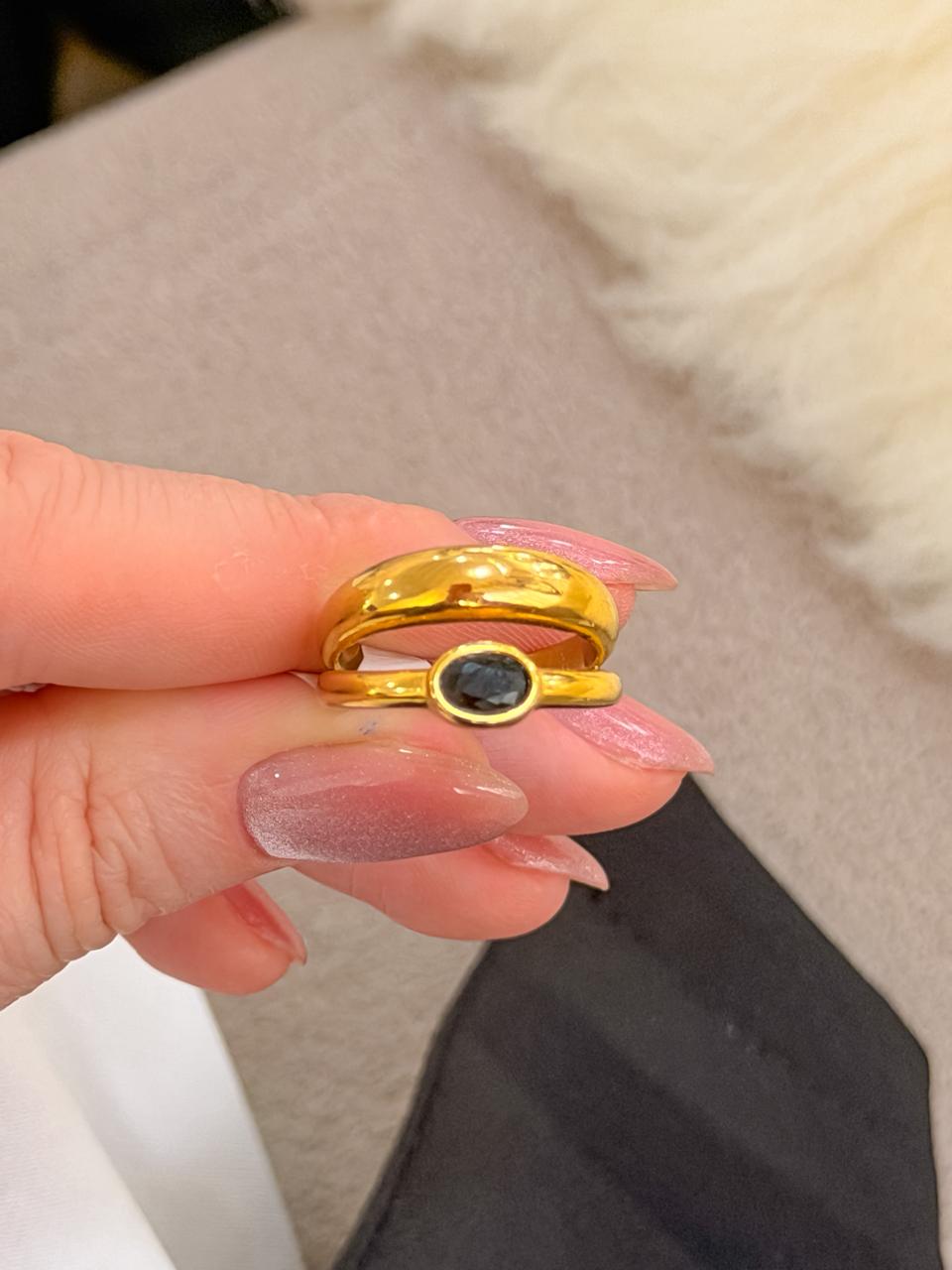 Anel liso duplo com pedra preta em aço inoxidável dourado.