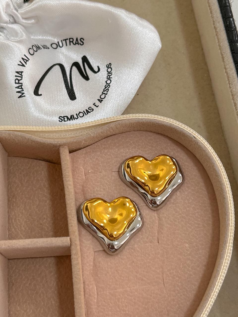 Brinco coração liso pequeno com detalhe acetinado em aço inoxidável dourado.