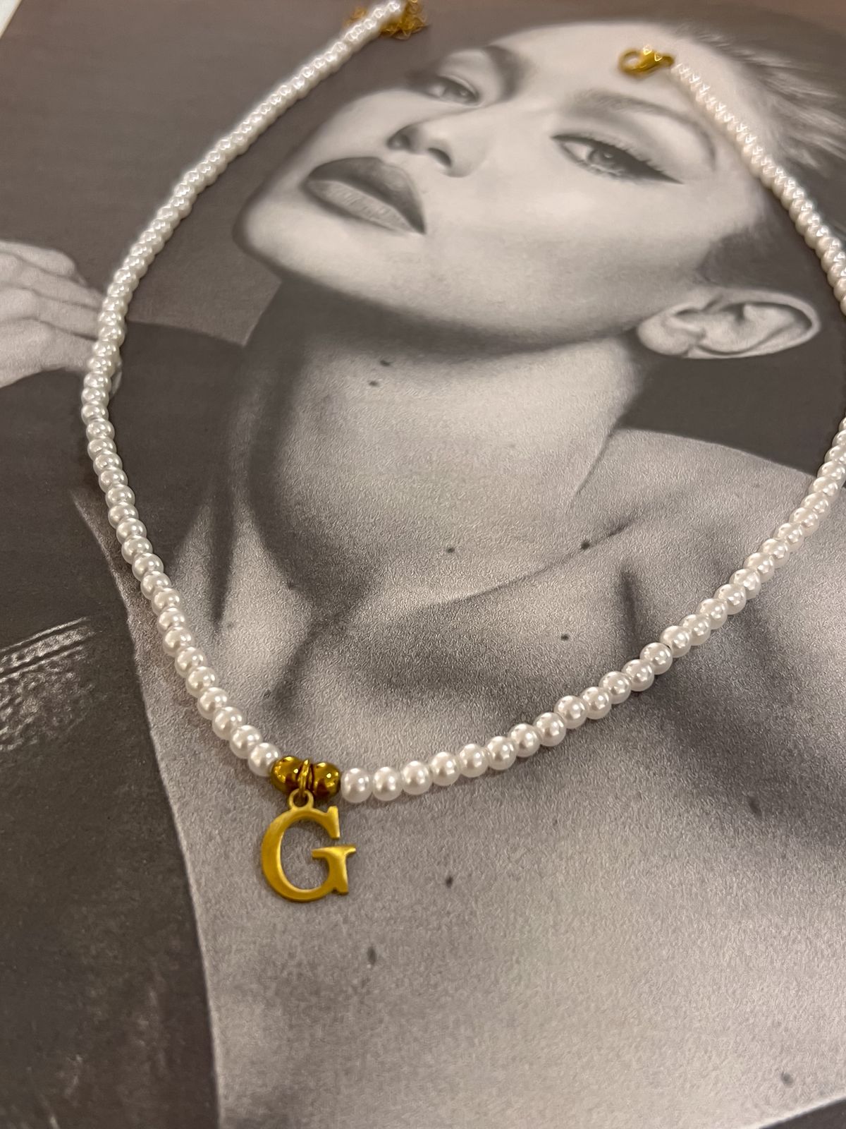 Colar letra G pérola em aço inoxidável com extensor.