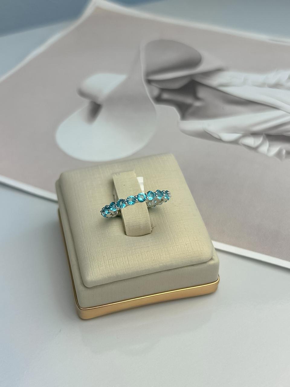 Anel todo em cristais na cor azul claro, banhado em ouro branco;