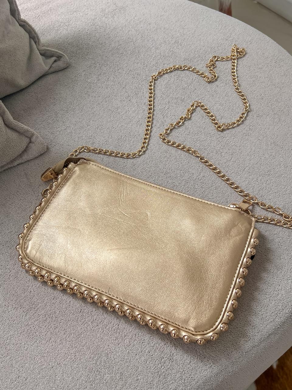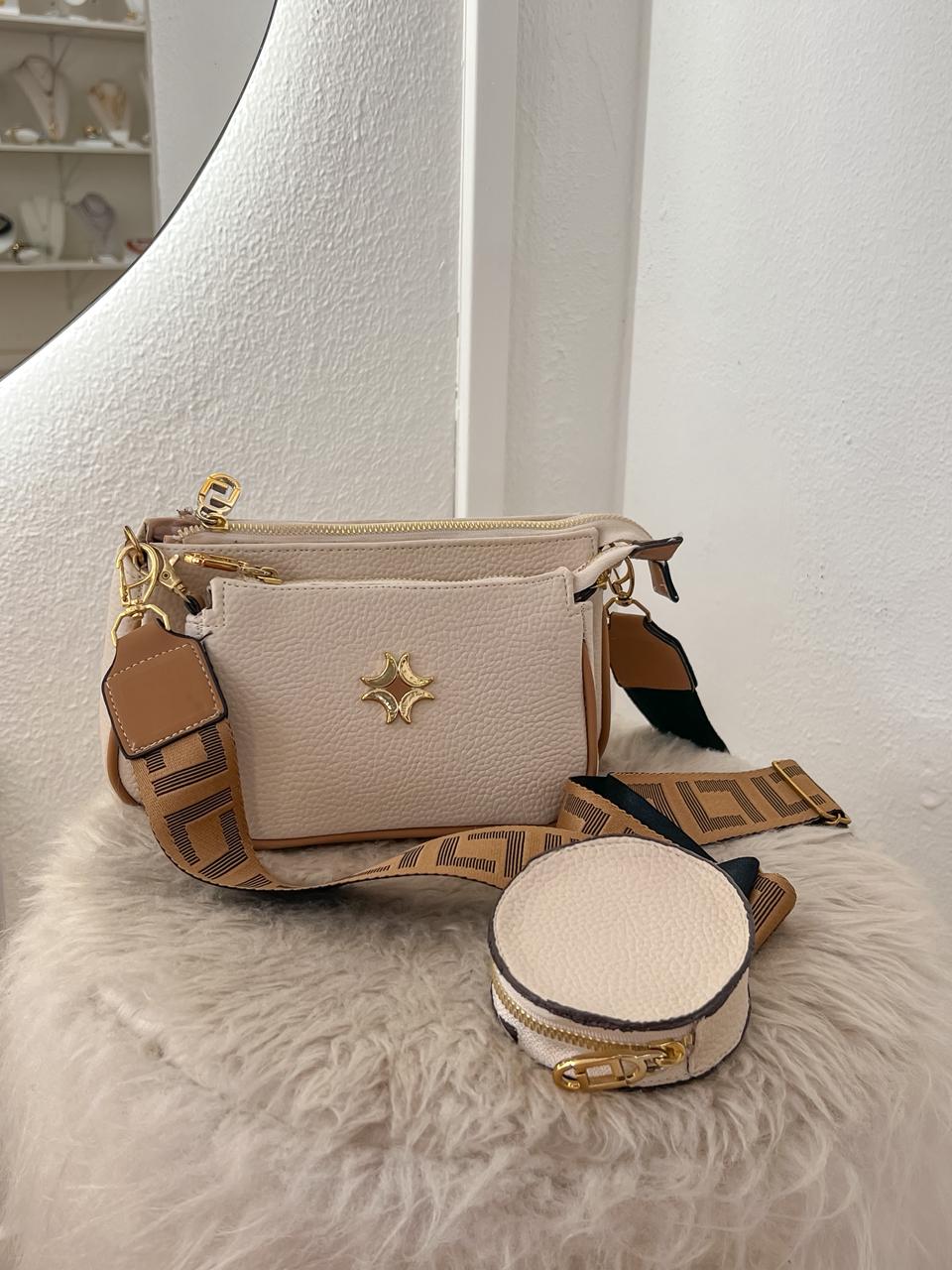 Bolsa inspiração luz da lua na cor bege com caramelo, possui alça alongada com niqueleira;