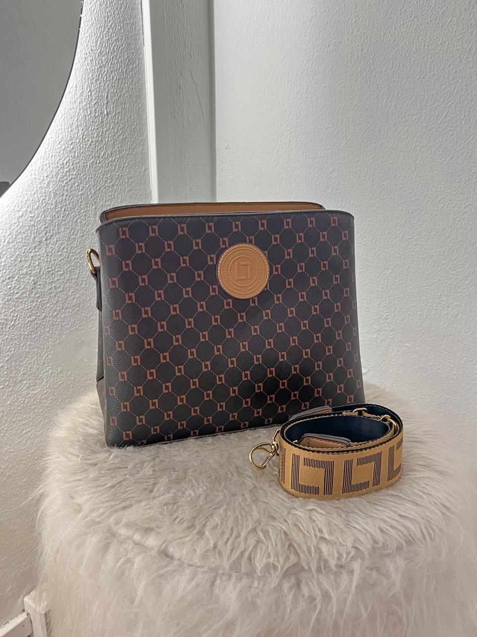 Bolsa inspiração luz da lua de coura ecológico no marrom, possui alça alongada;