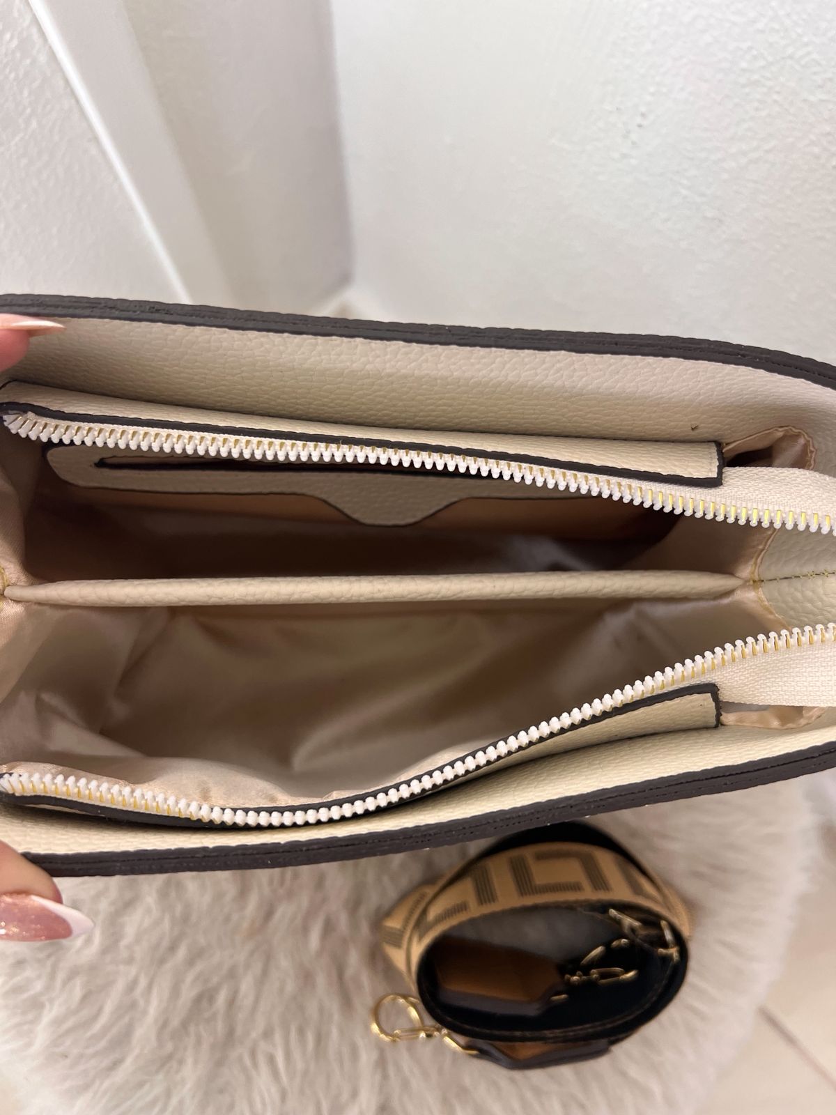 Bolsa inspiração luz da lua off em couro ecológico com detalhes marrom, acompanha alça transversal;
