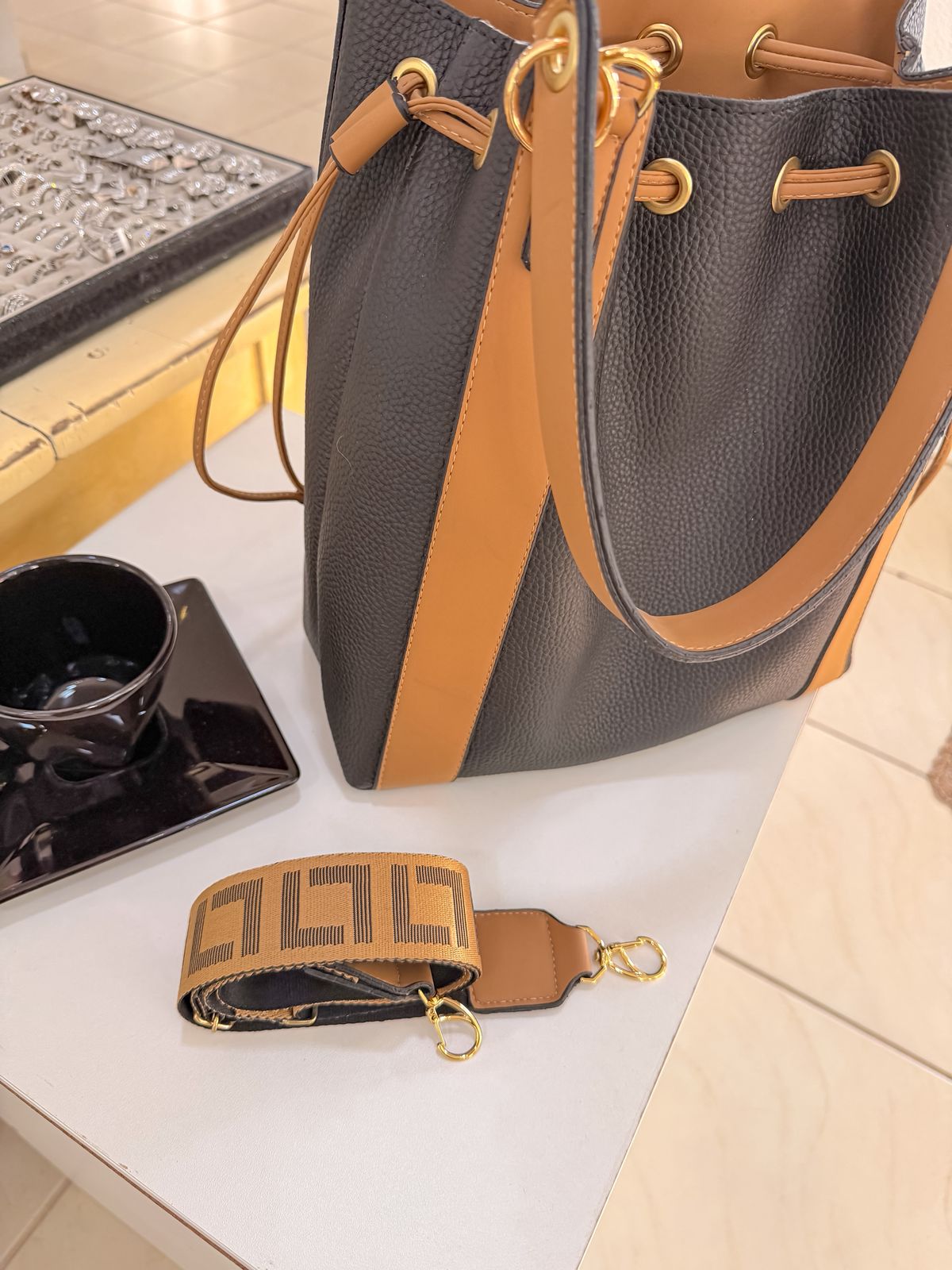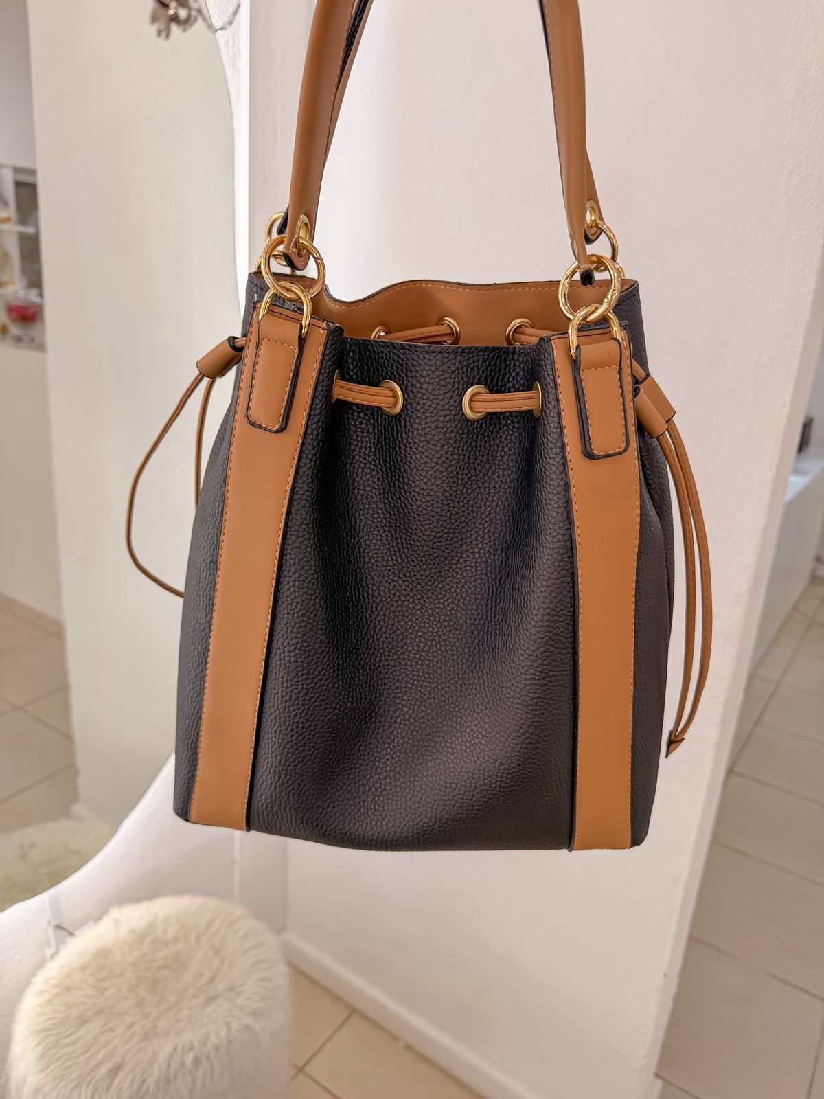 Bolsa saco inspiração Luz da Lua em couro ecológico preto com sobreposição do marrom;
