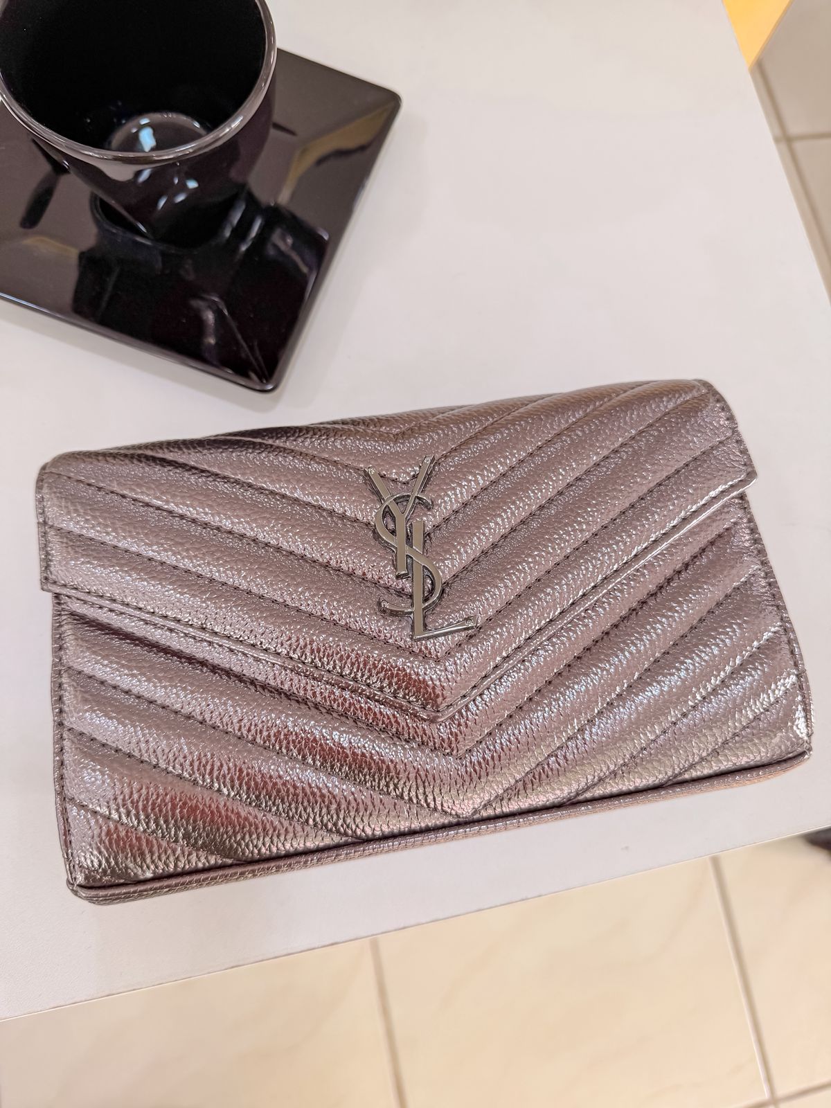 Bolsa inspiração YSL grafite com divisória e alça transversal em correntaria.