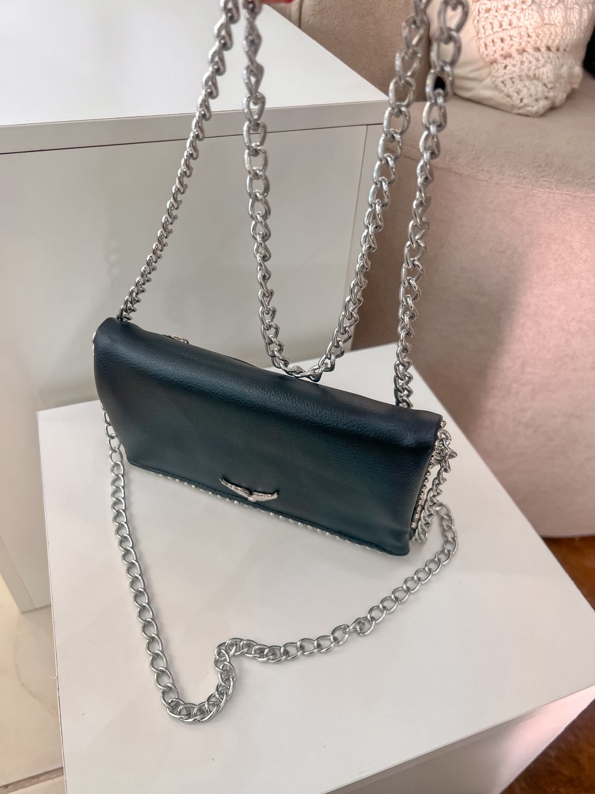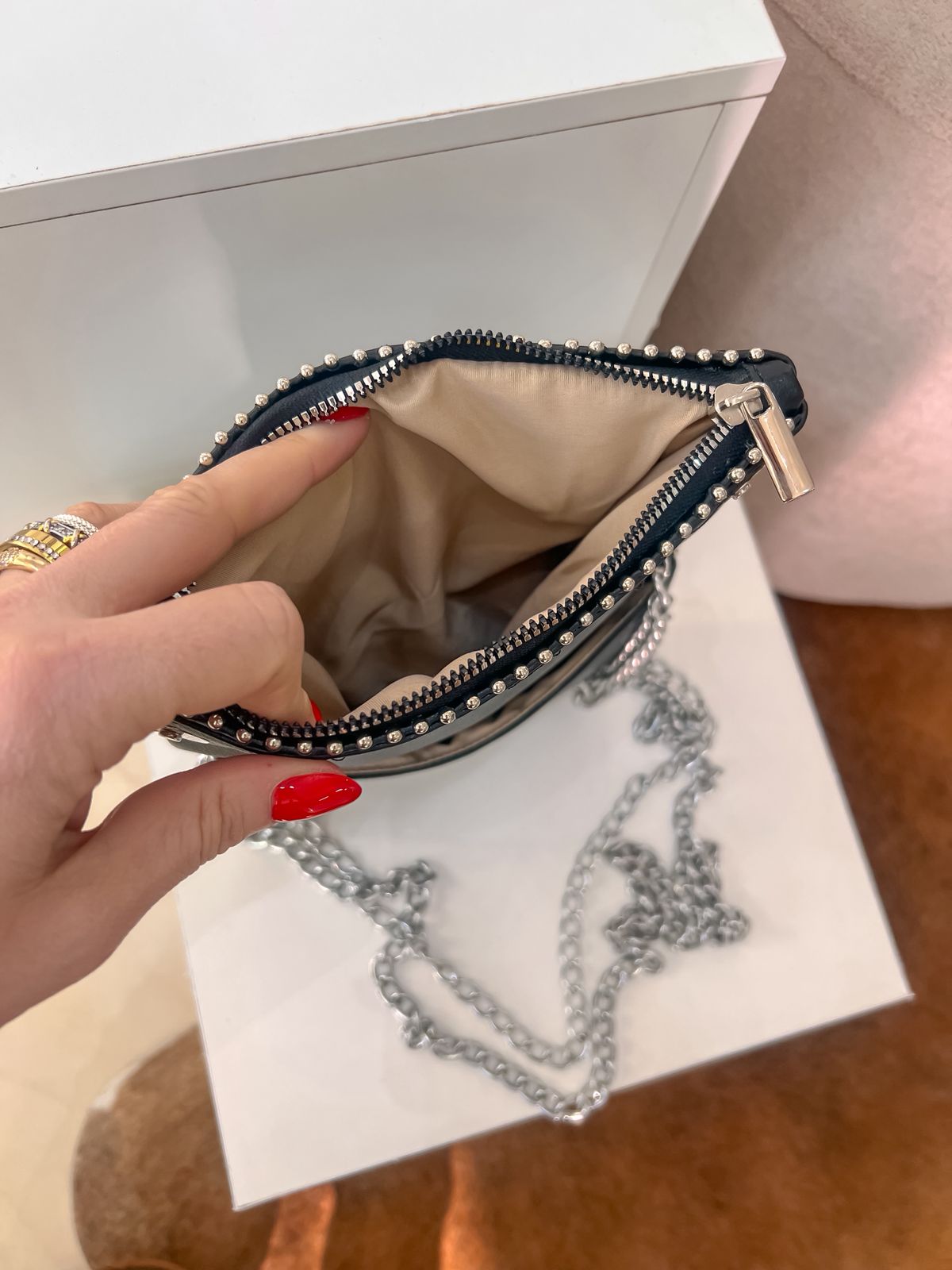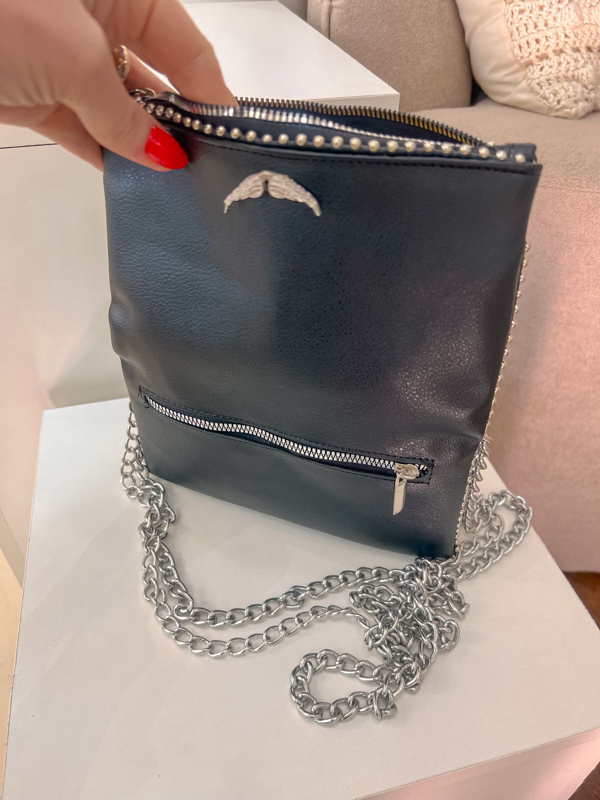 Bolsa preta inspiração Zadig com detalhes em prata possui 2 compartimentos e corrente para cintura e ombro.