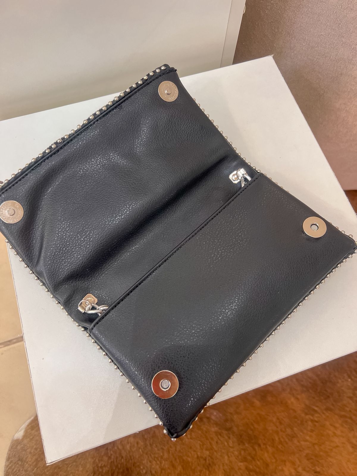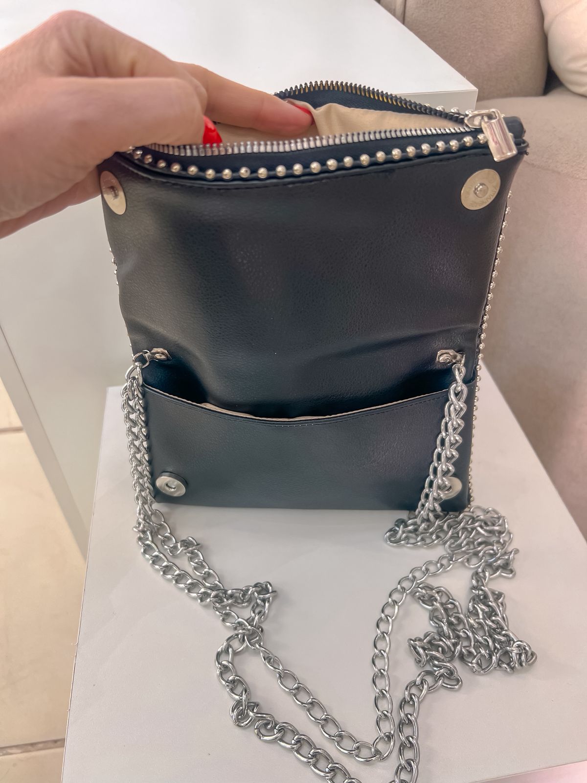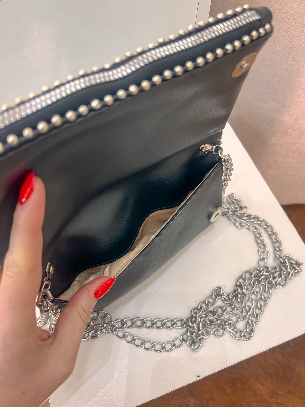 Bolsa preta inspiração Zadig com detalhes em prata possui 2 compartimentos e corrente para cintura e ombro.