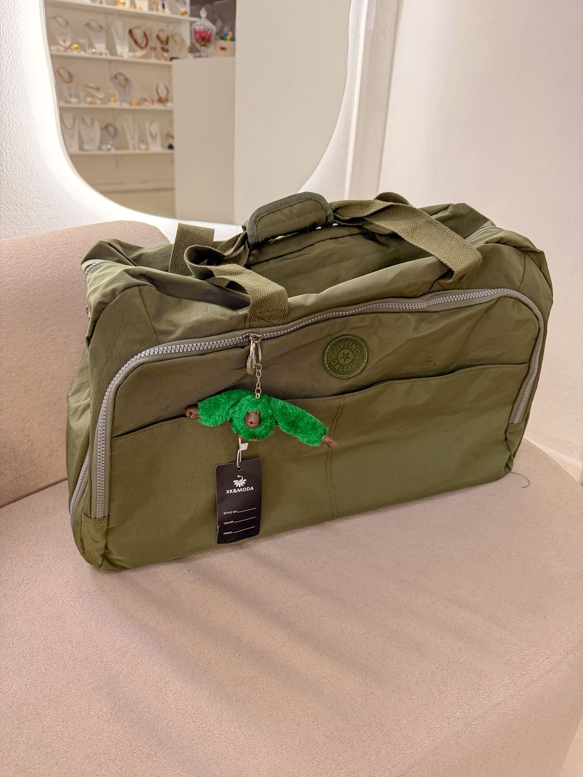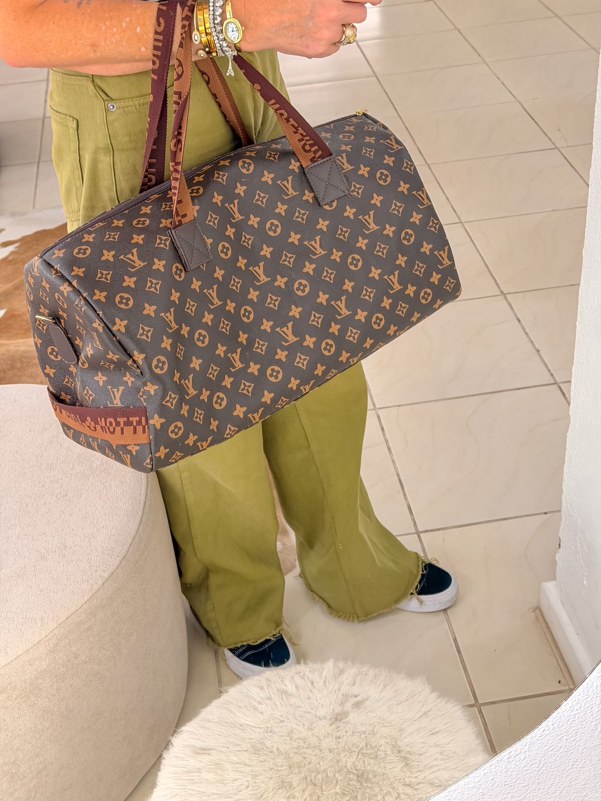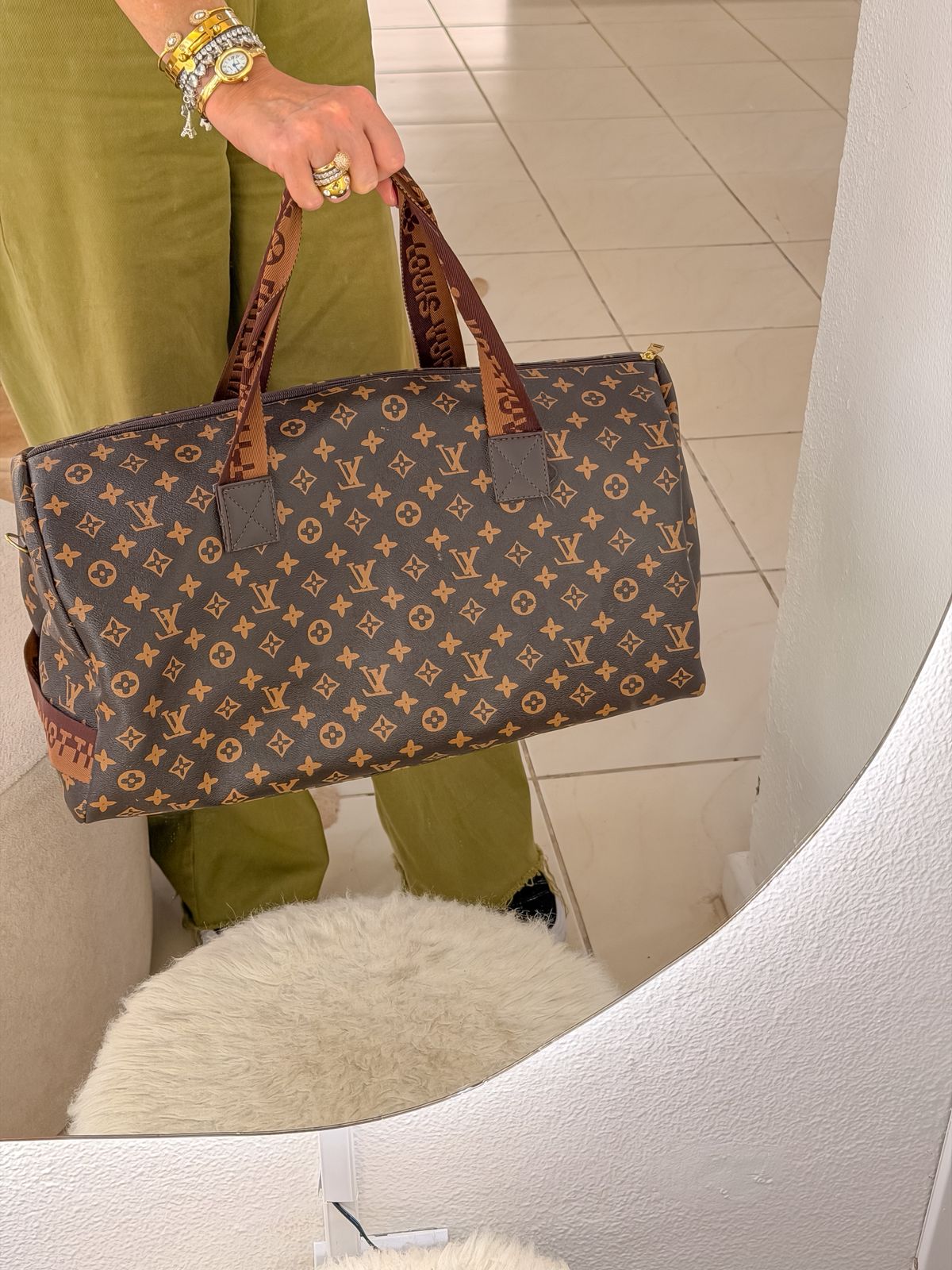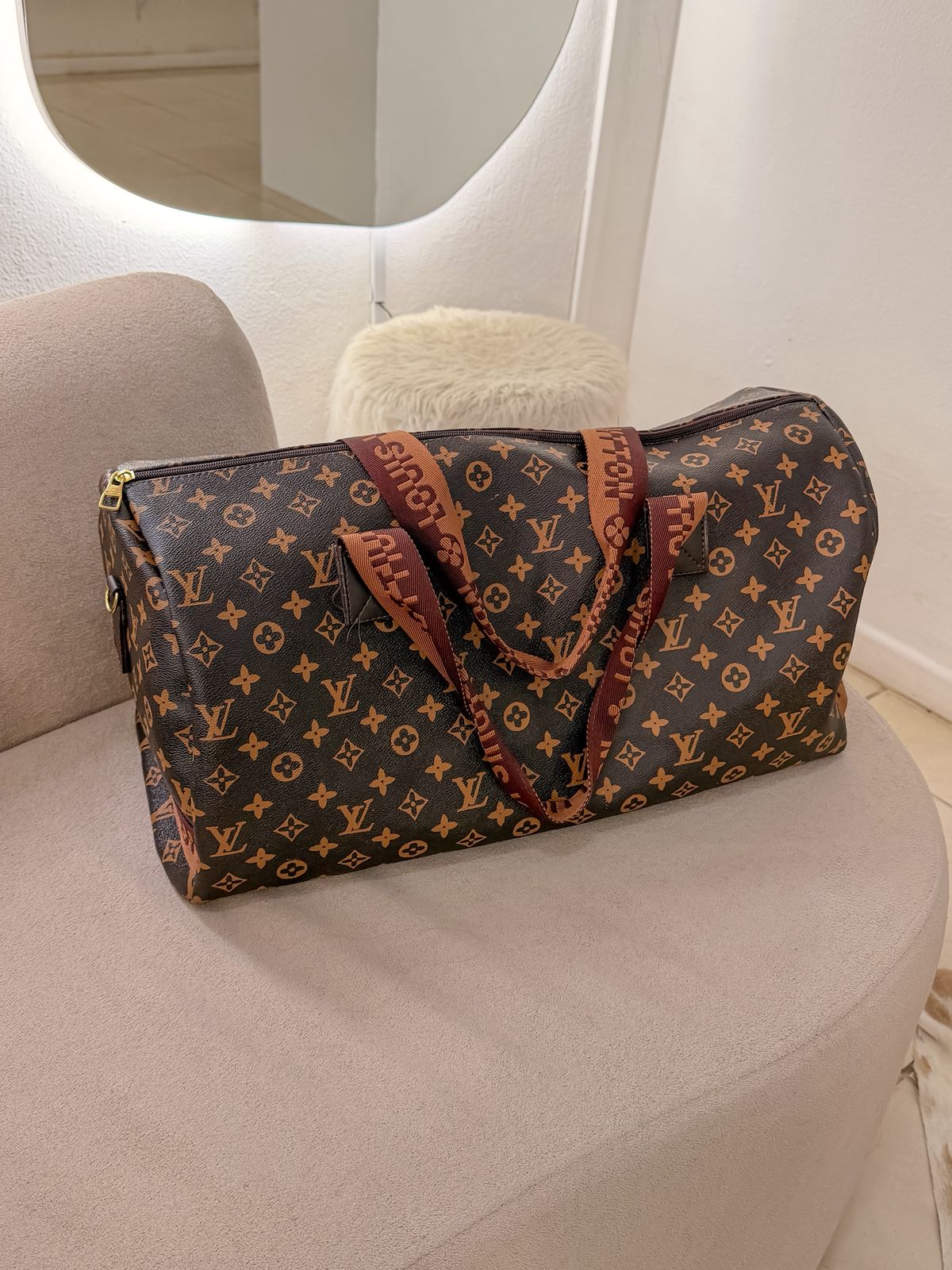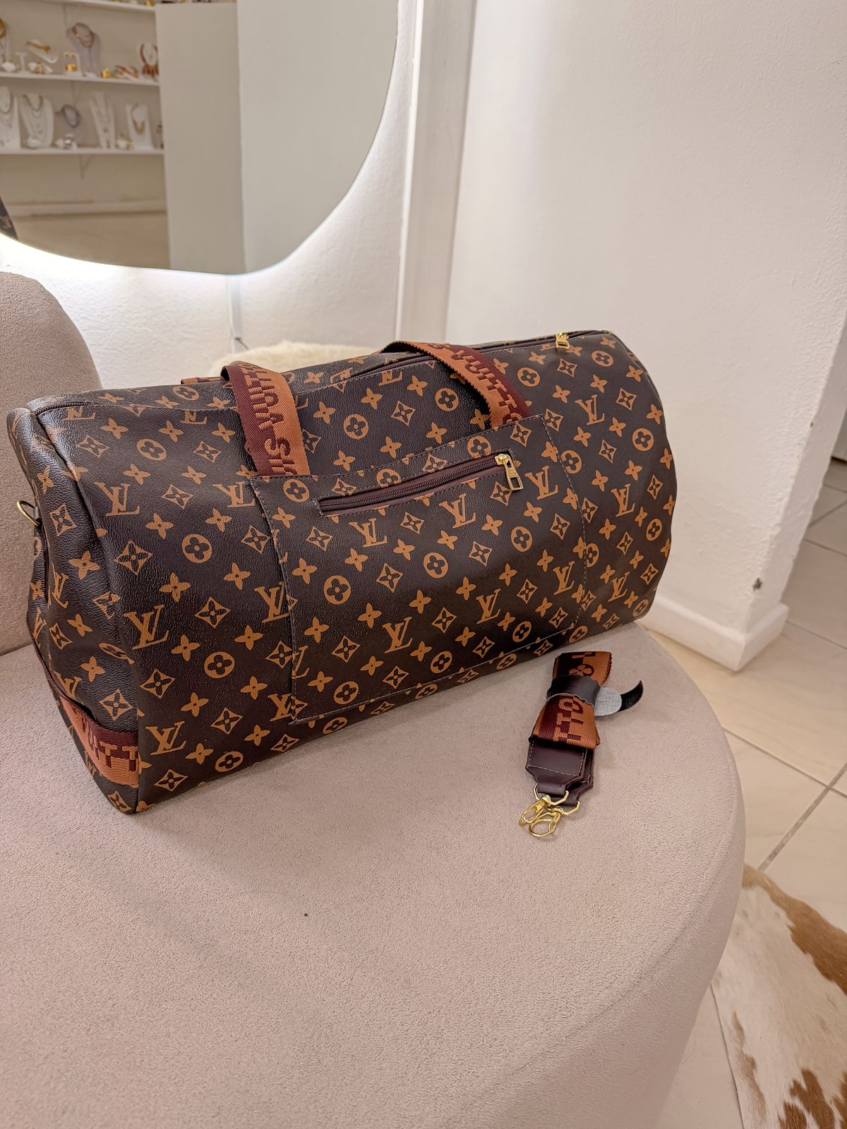 Mala inspiração Louis Vuitton grande em couro ecológico marrom estampado, com bolsa externo funcional e suporte atrás para prender em mala, acompanha alça transversal.