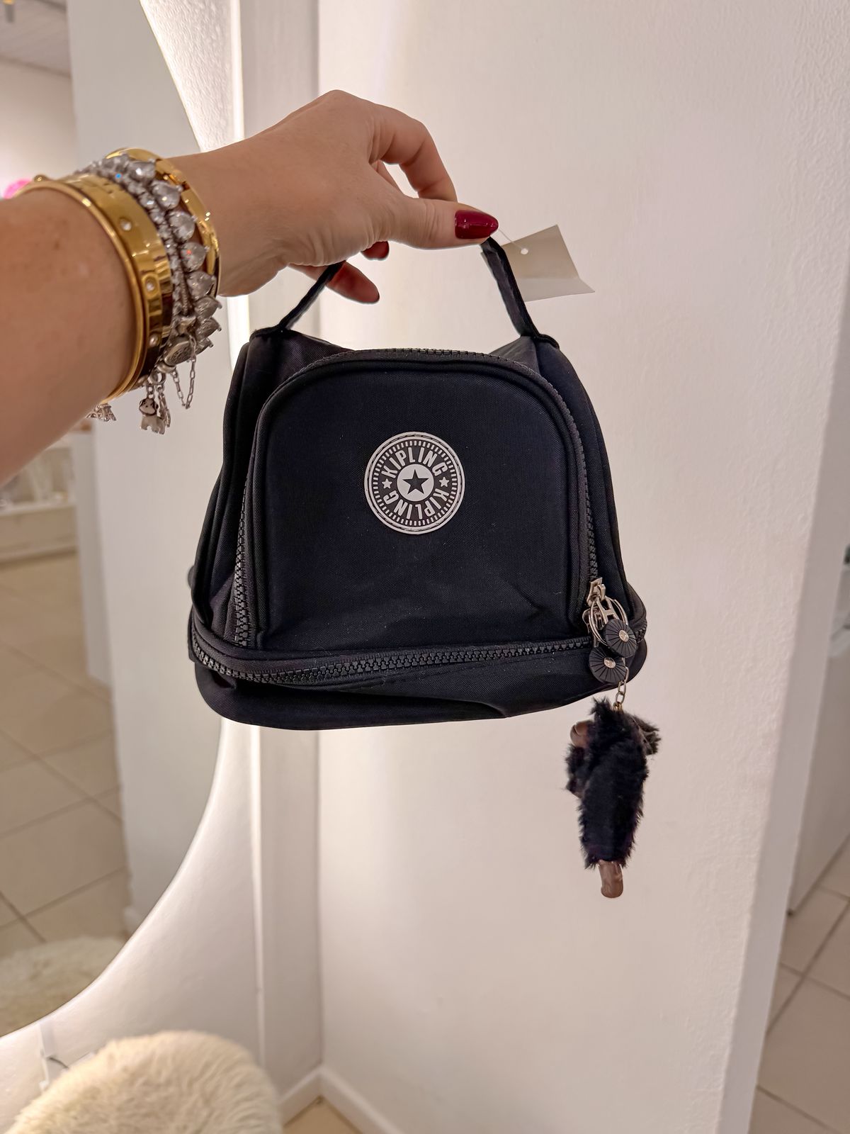 Mala Kipling preta grande acabamento impermeável, com várias repartições com zíper, acompanha pingente macaco e alça transversal.
