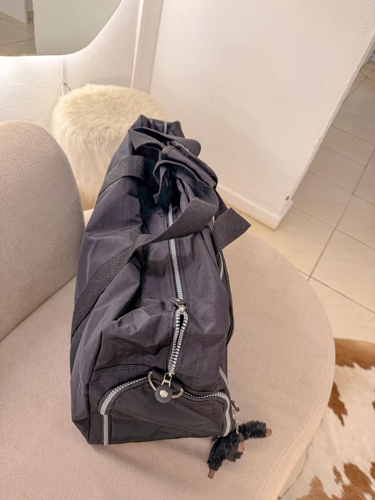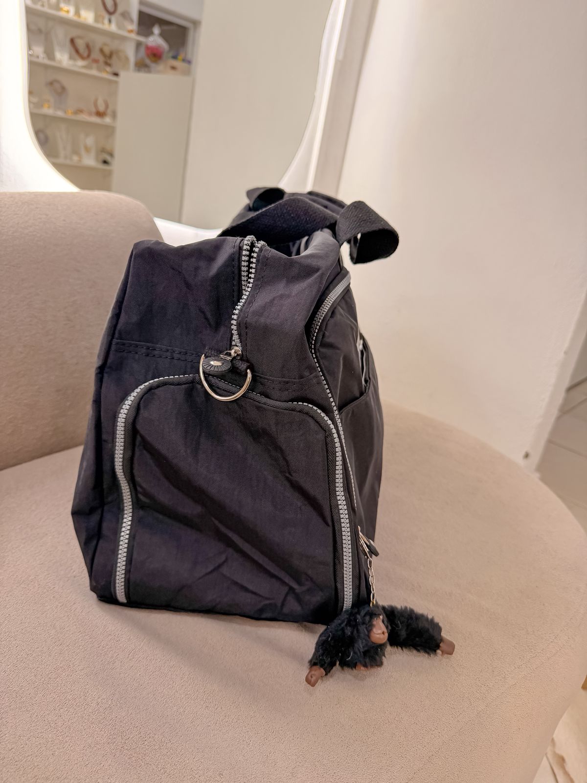 Mala Kipling preta grande acabamento impermeável, com várias repartições com zíper, acompanha pingente macaco e alça transversal.
