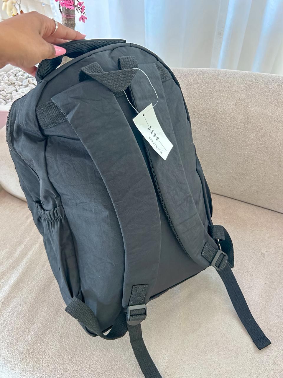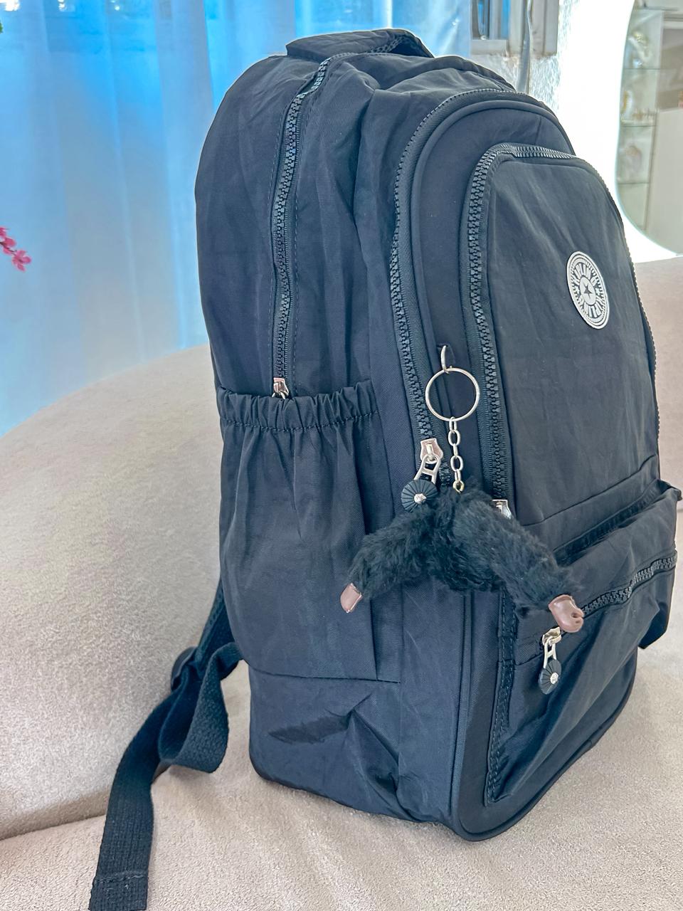Mochila kipling preta com divisórias, impermeável e acompanha pingente;