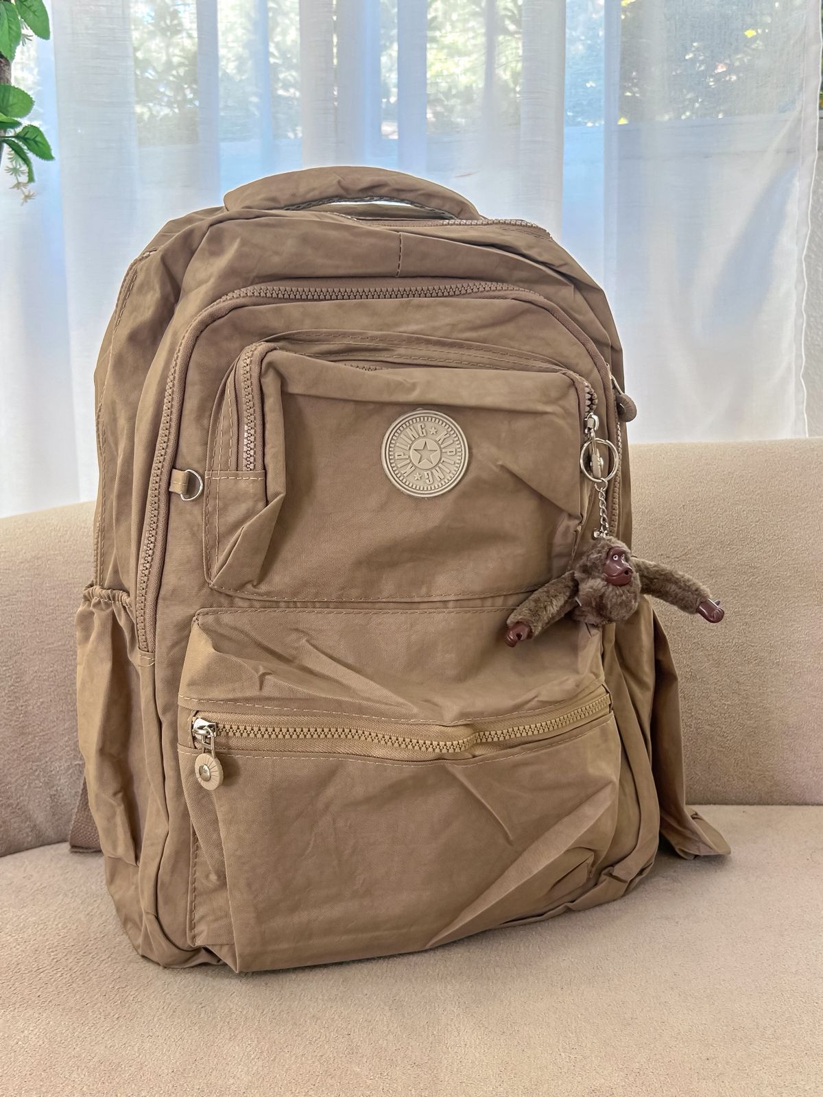 Mochila Kipling impermeável estampada, acompanha pingente.