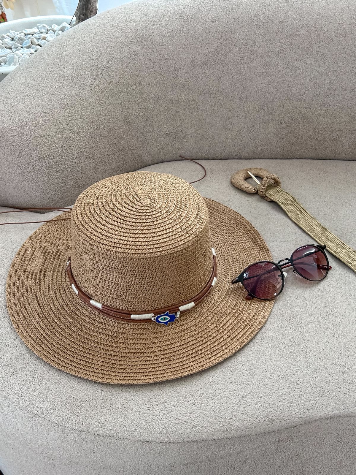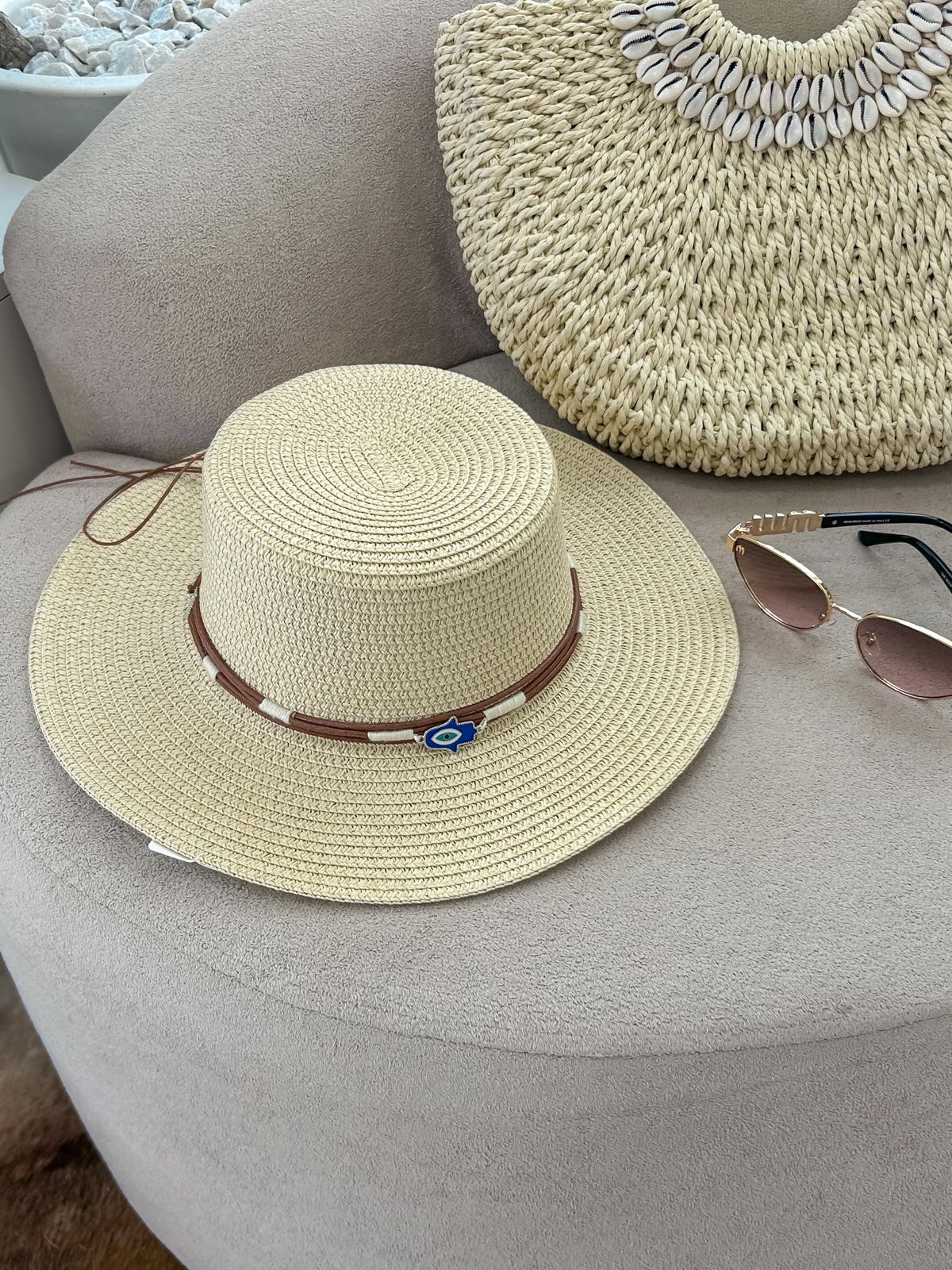 Chapéu de palha maragogi na cor bege com detalhe em corda e pingente de mão de Fátima com olho grego;