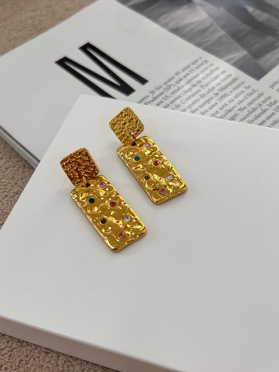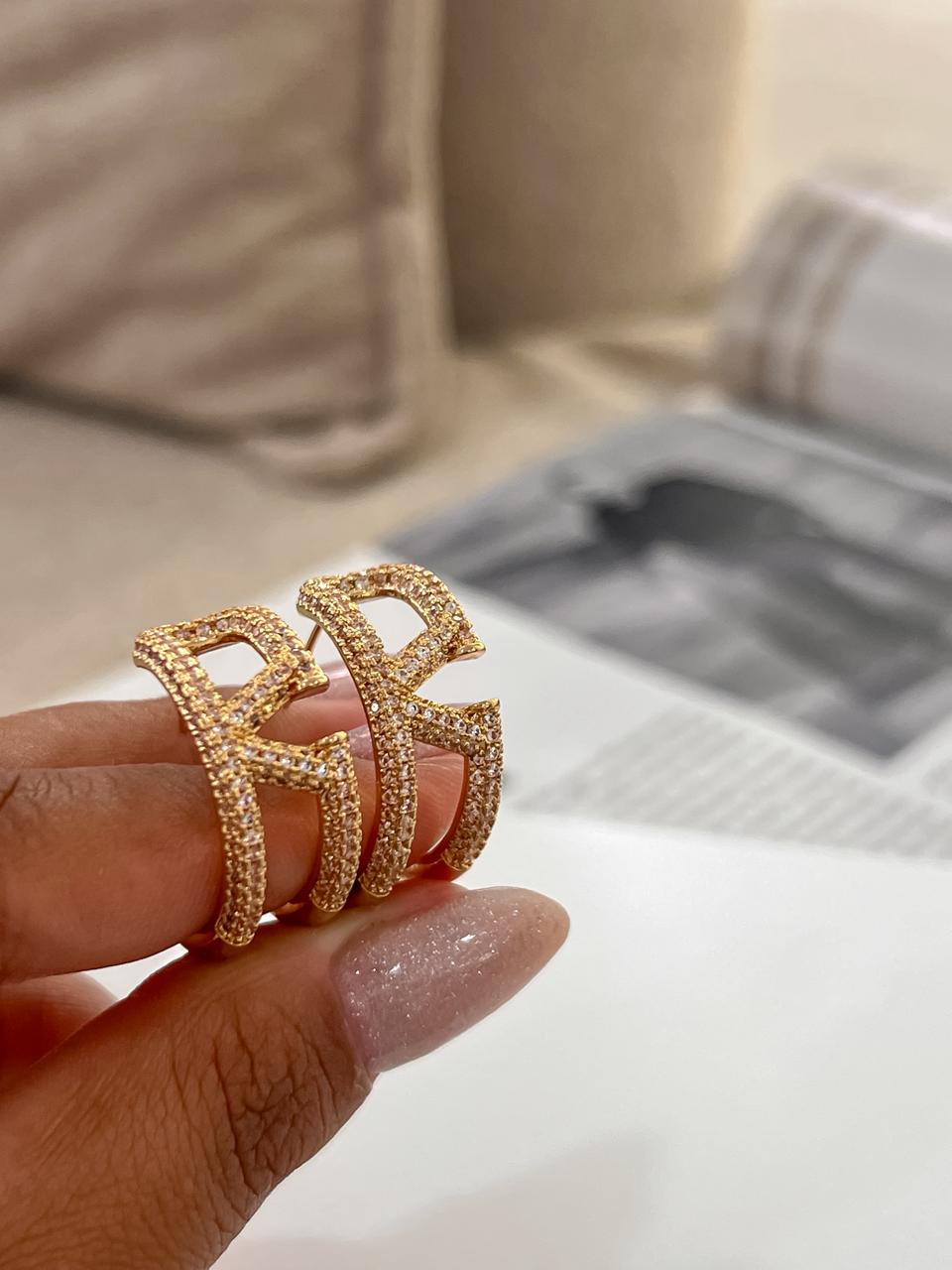 Argola inspiração de jóia cravejada folheada em dourado.