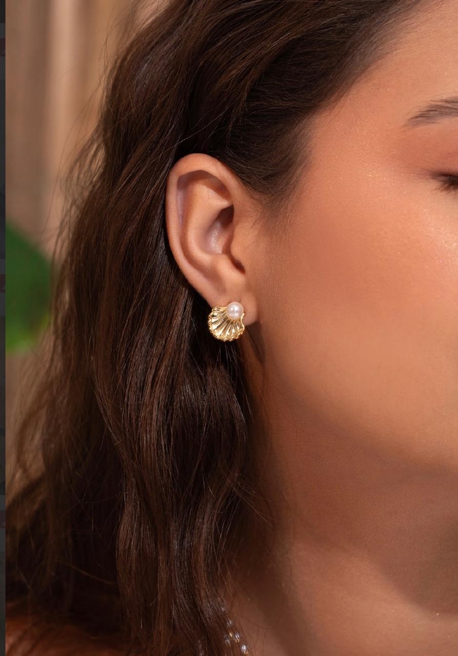 Brinco concha com detalhe de pérola banhado em ouro 18k;