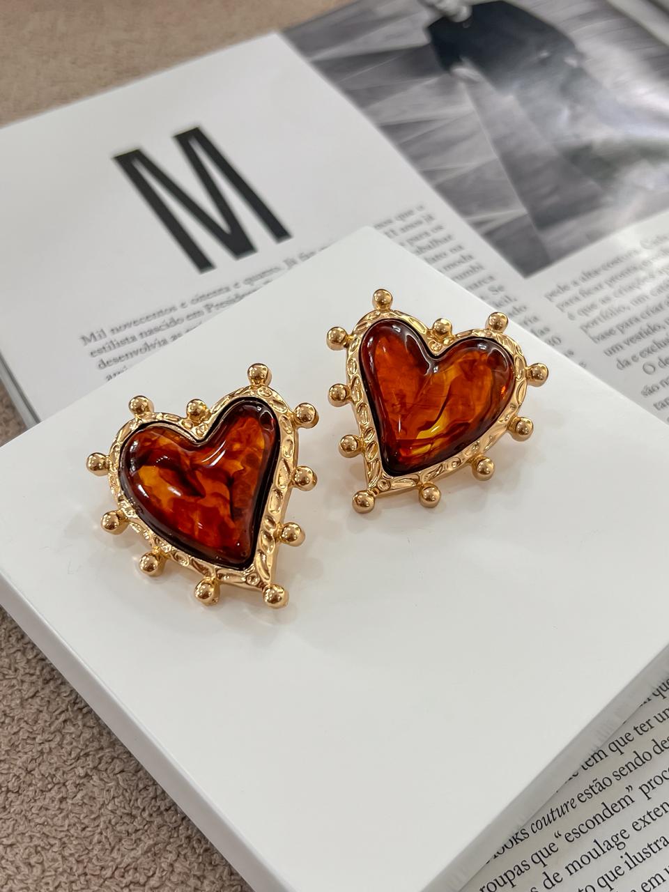 Brinco coração marrom com detalhe de esferas folheado no dourado.