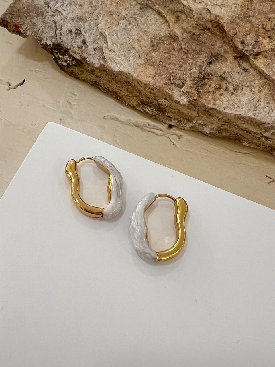 Brinco orgânico com detalhe branco em aço inoxidável no dourado.