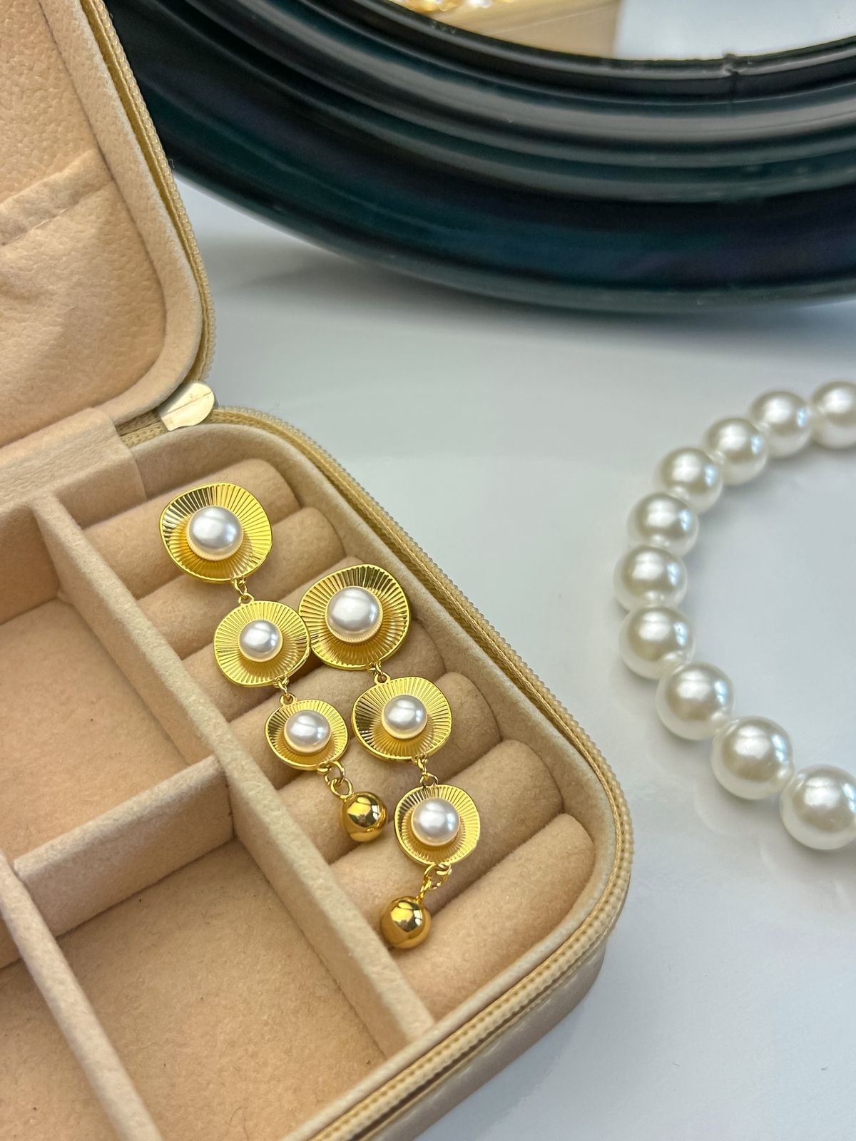 Brinco dourado com detalhes e 3 pérolas em aço inoxidável.