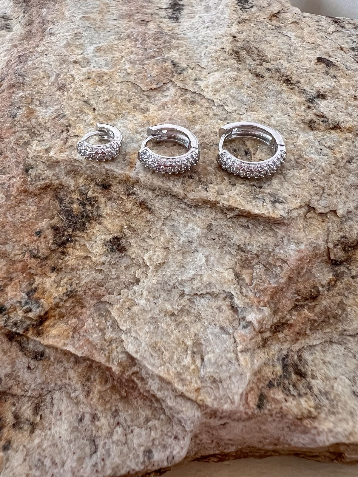 Trio de argolas lisas com detalhe de zircônias banhado em ouro branco;