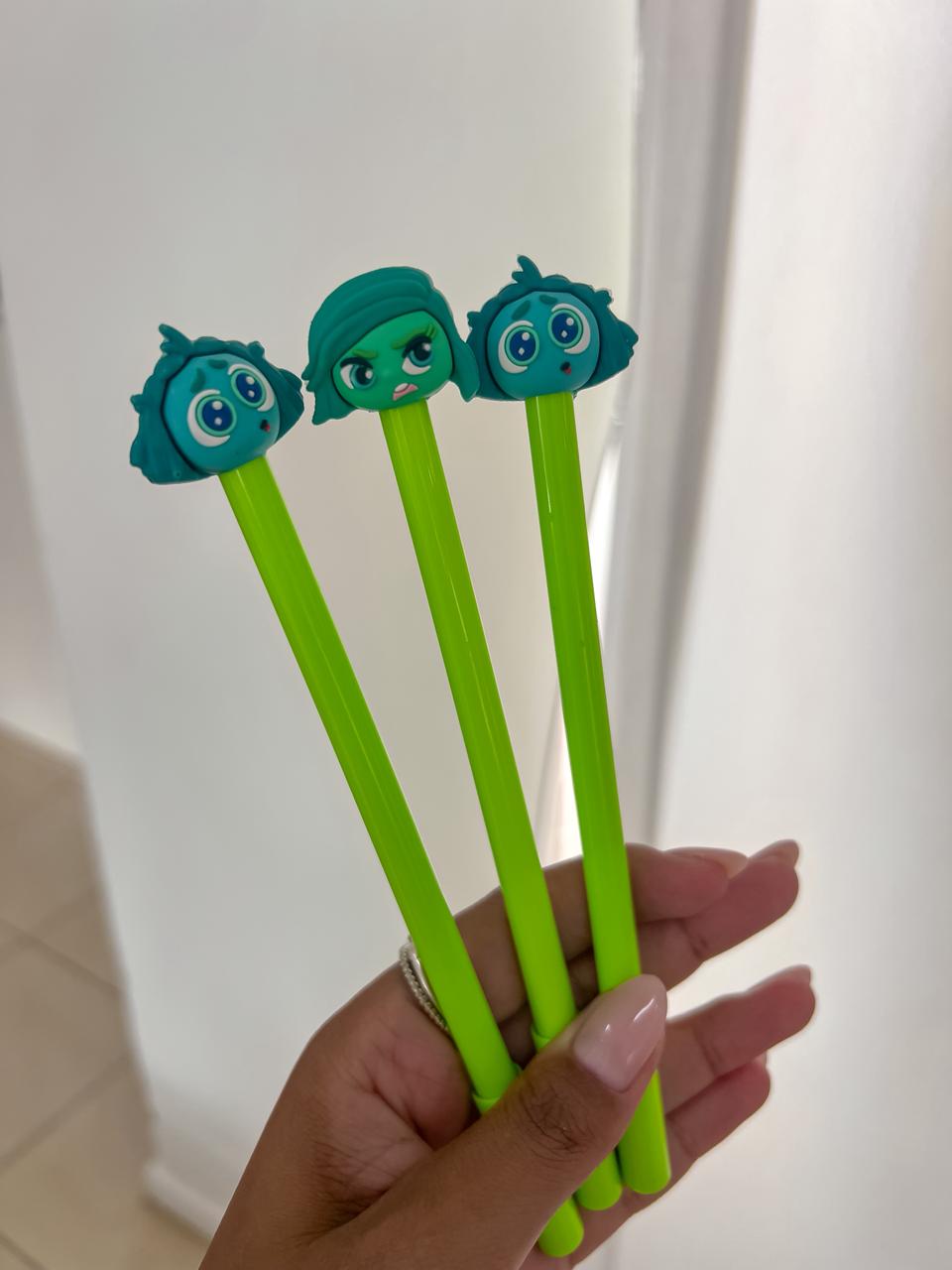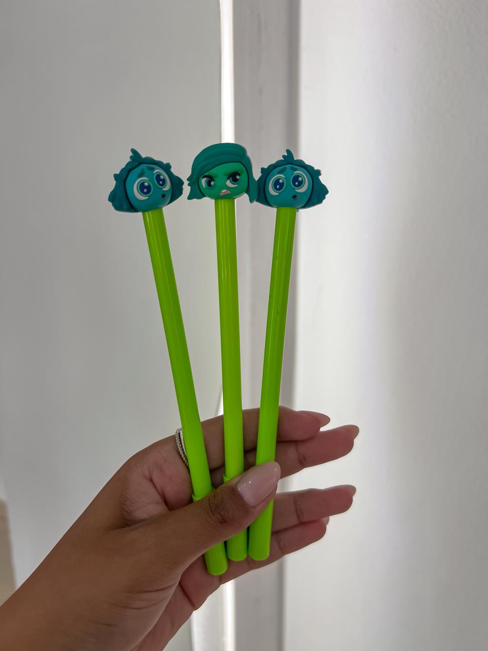 Canetas temática do personagem nojinho e inveja do filme “Divertida Mente”.