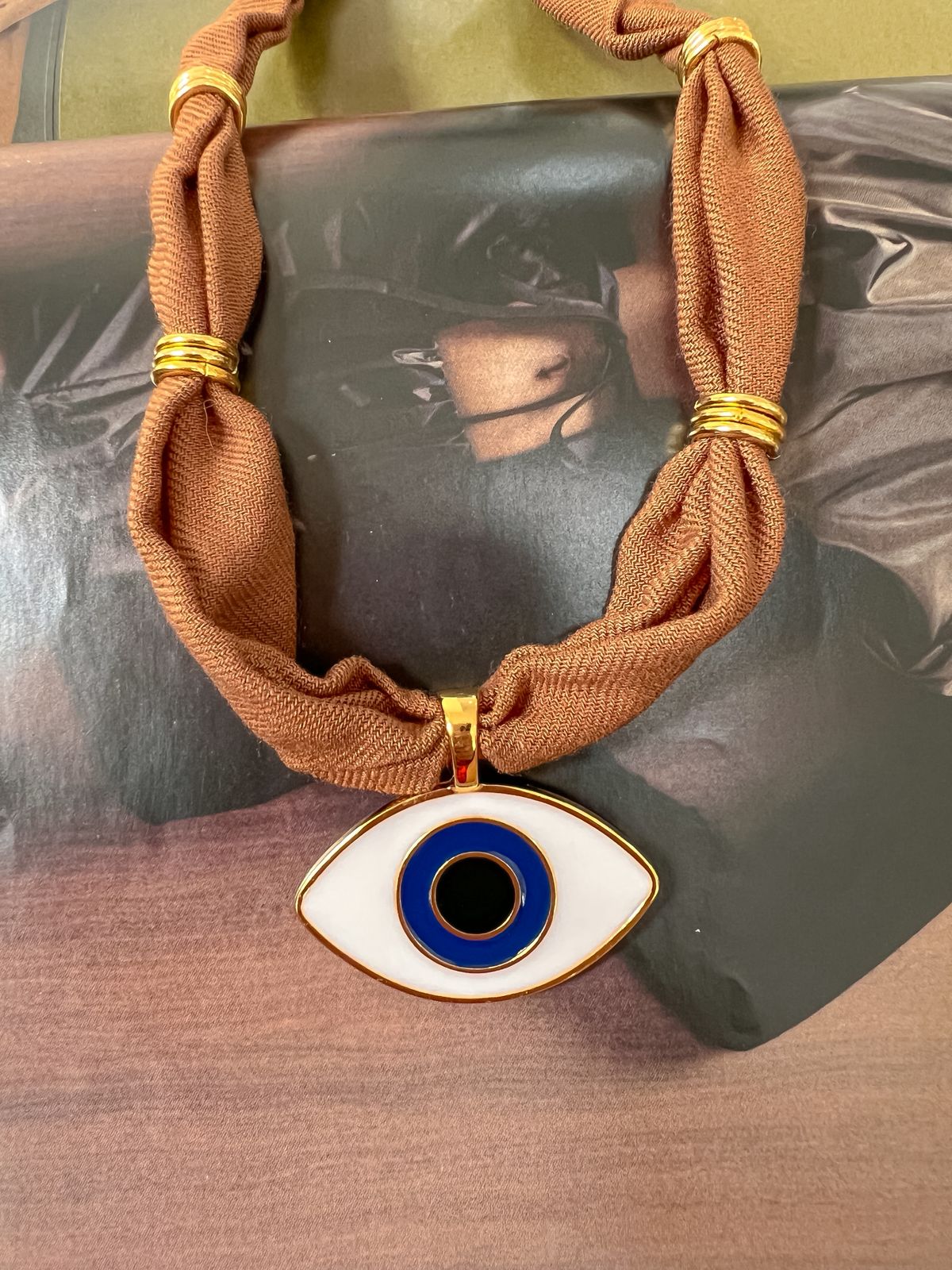 Choker de tecido preto com pingente de olho marrom com detalhes dourados, em aço inoxidável, possui extensor.