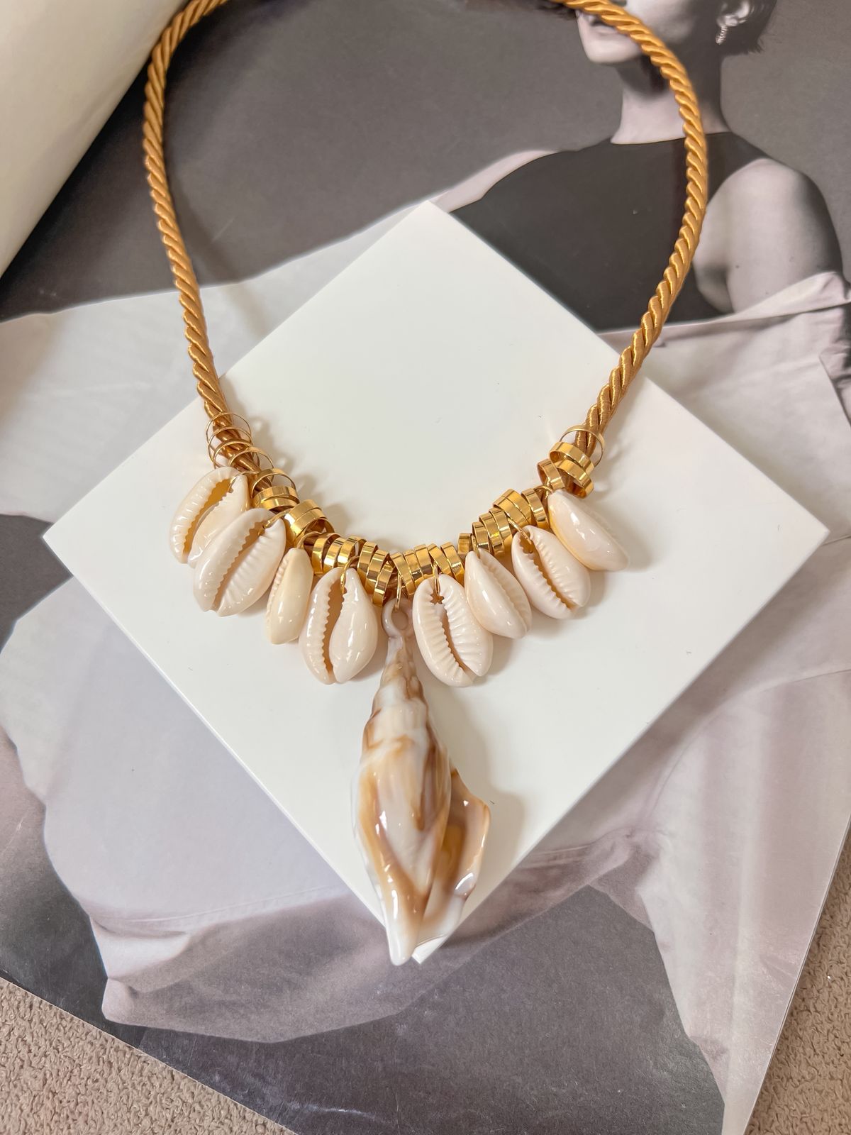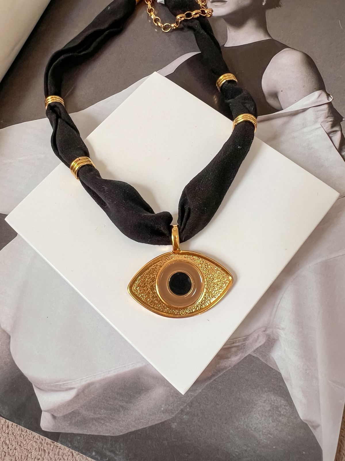 Choker de tecido com pingentes de estrelas e peixe em aço inoxidável no dourado, possui extensor.