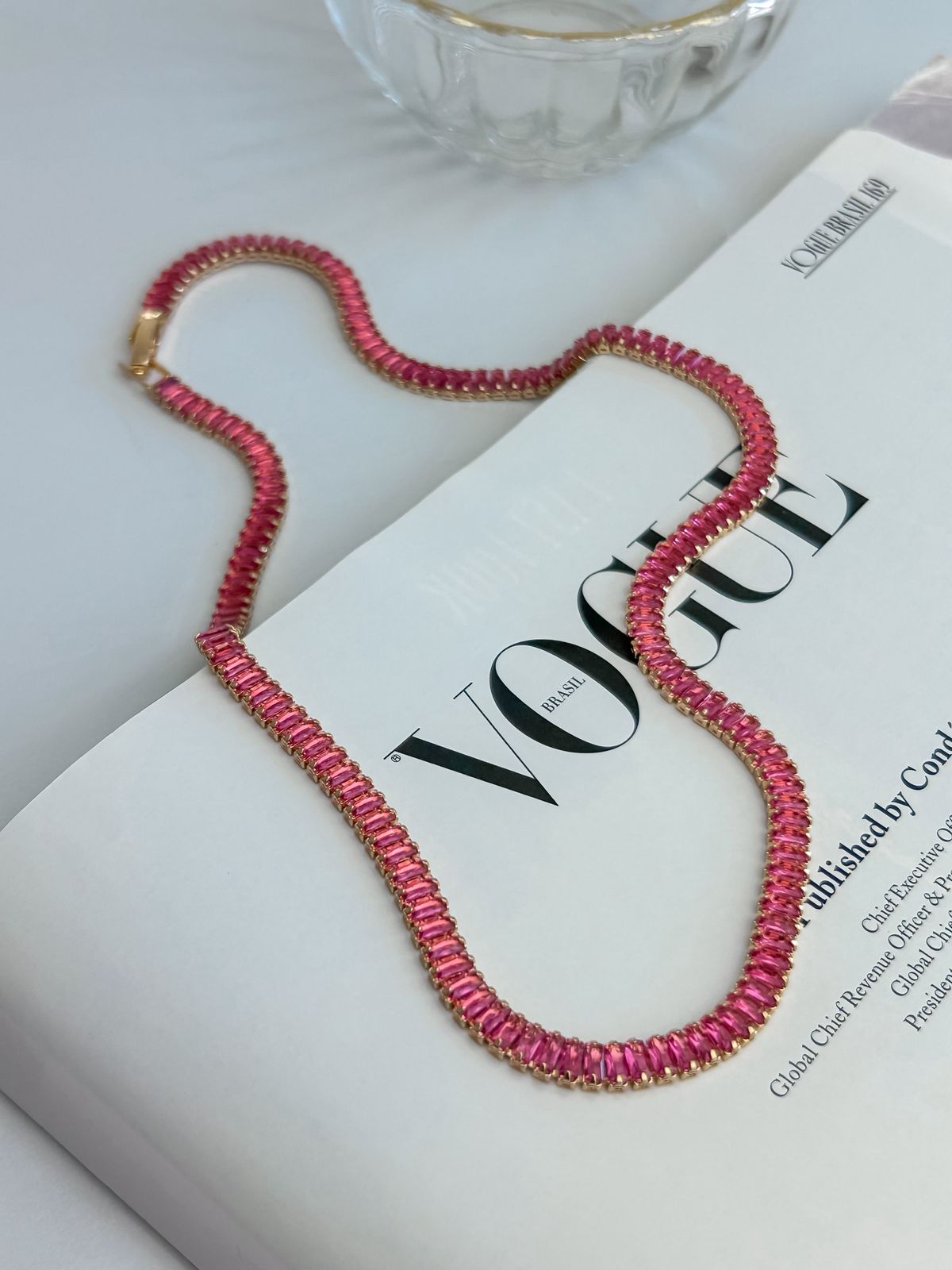 Choker riviera baguete rosa banhada em ouro 18k com fecho gaveta;