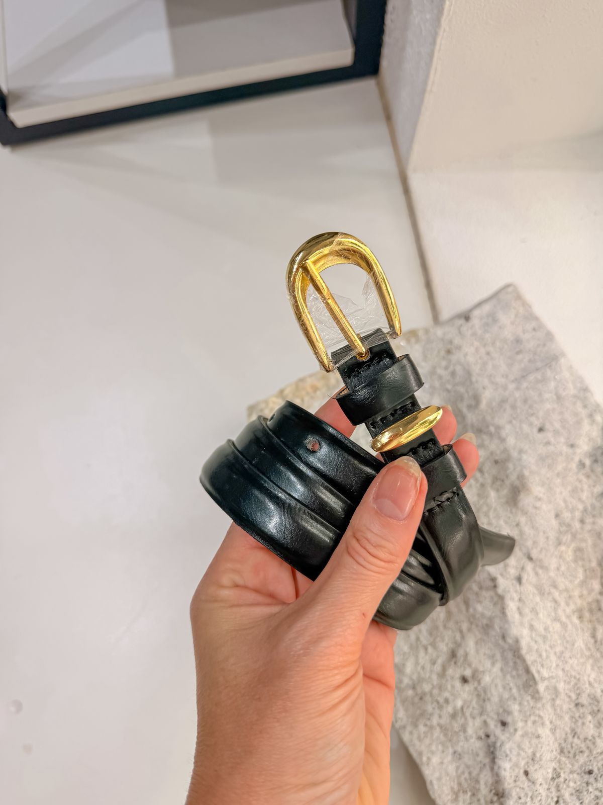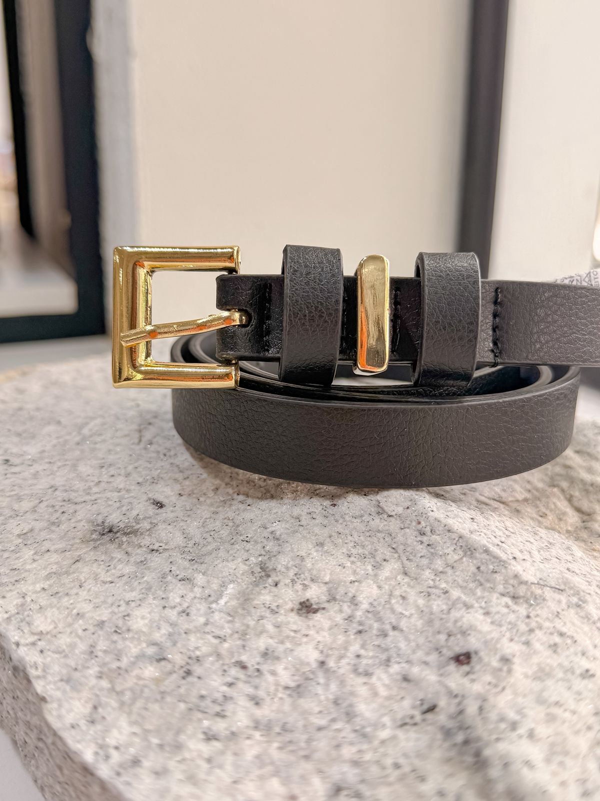 Cinto preto em couro ecológico caramelo com fivela quadrada em metal dourado.