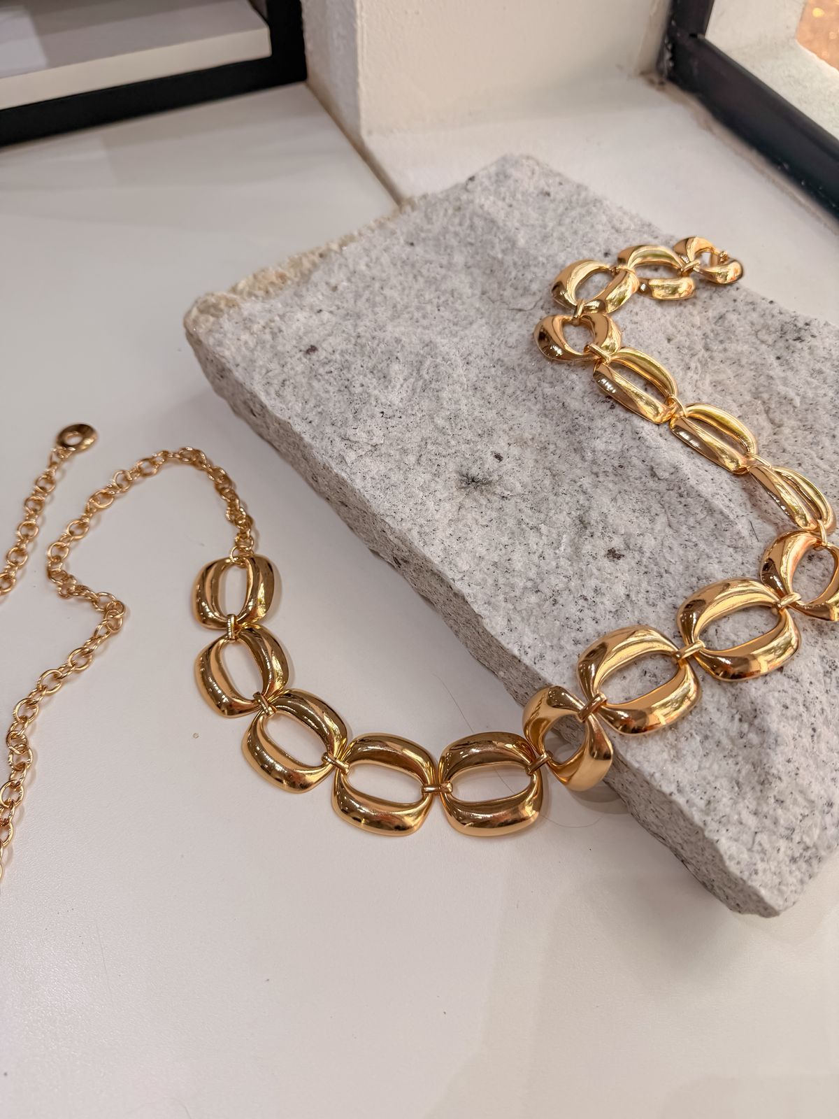 Cinto liso quadrado em dourado com extensor em correntaria e fecho lagosta.