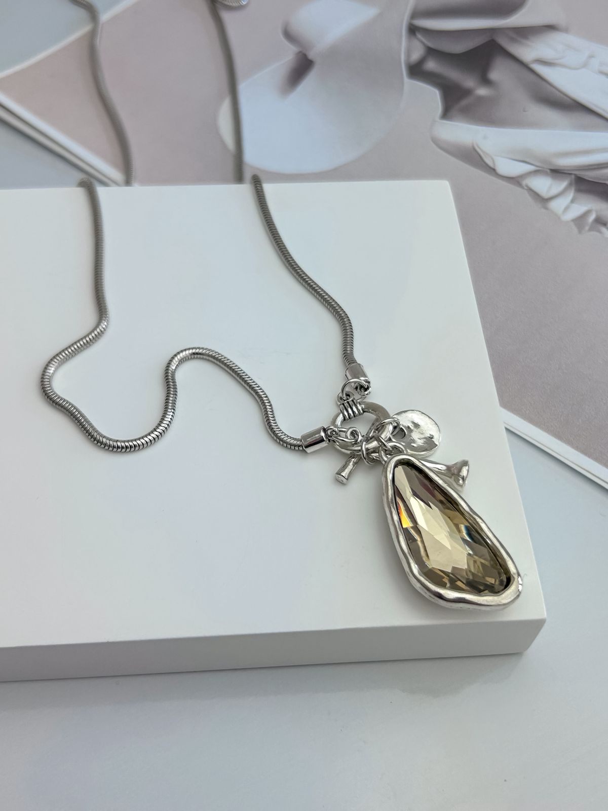 Colar com pingente orgânico ajustável em aço inoxidável no prata.