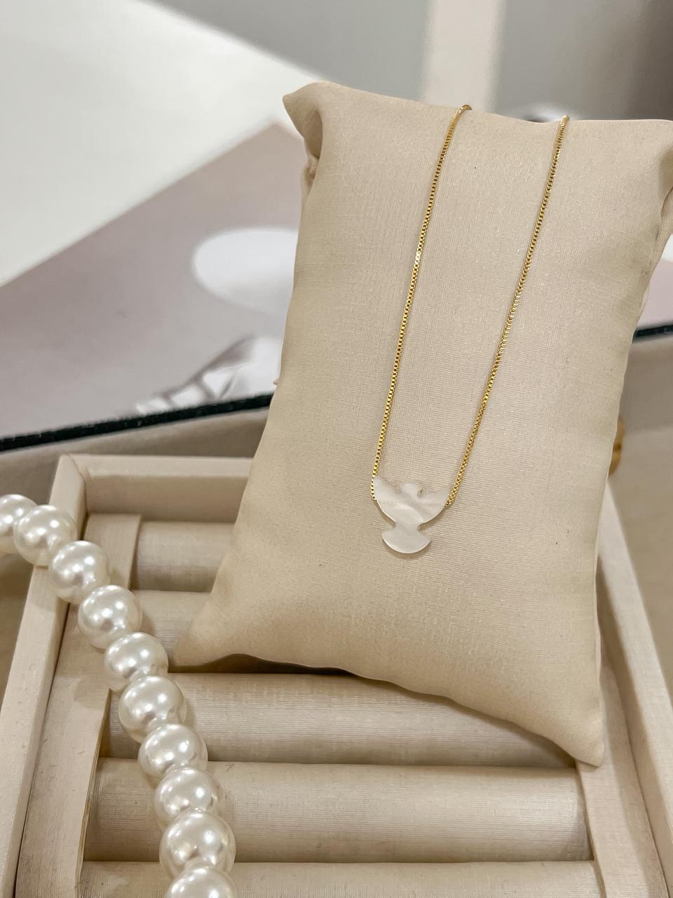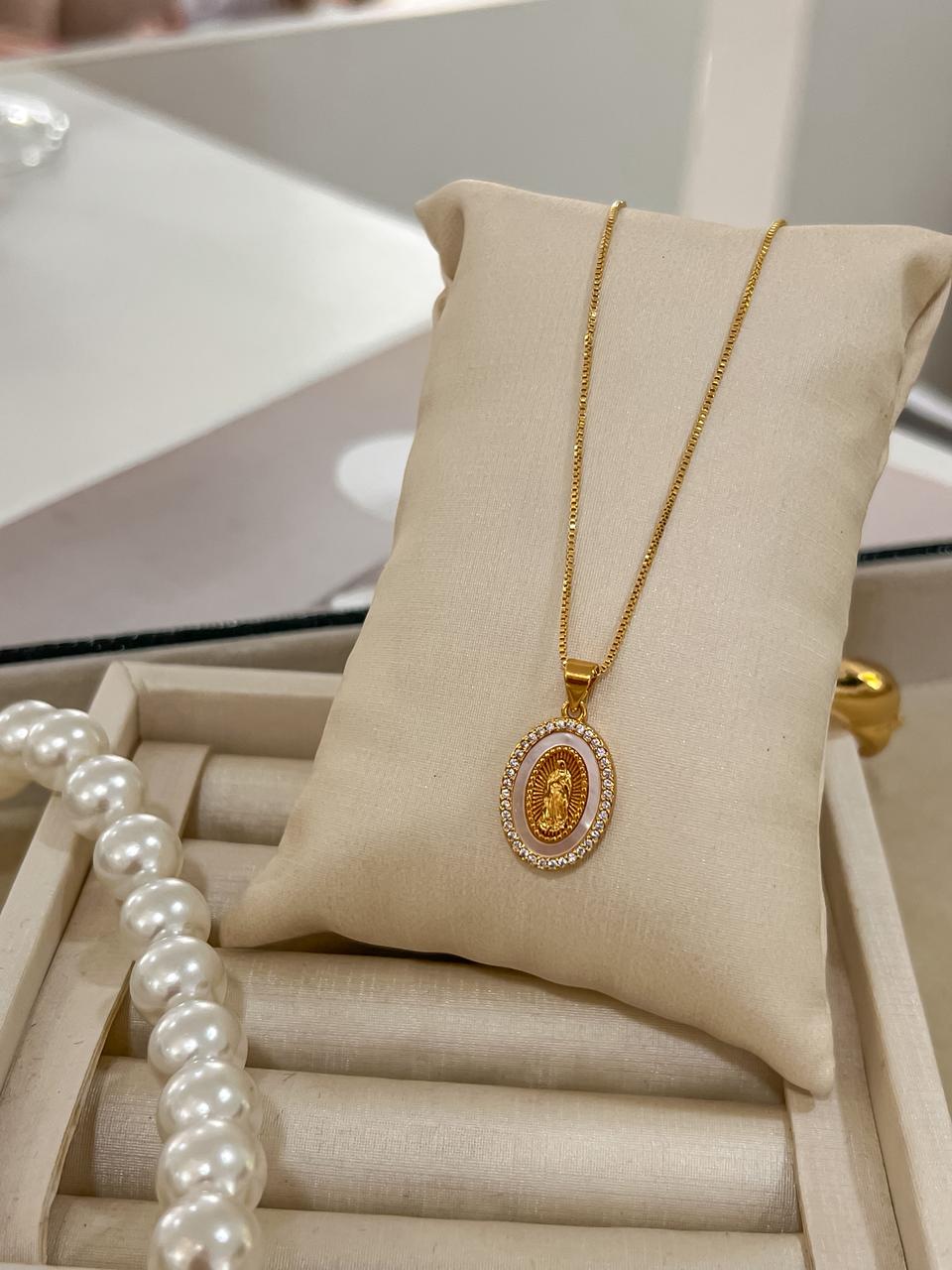 Colar Nossa senhora com madrepérola e zircônia banhado em ouro 18k;