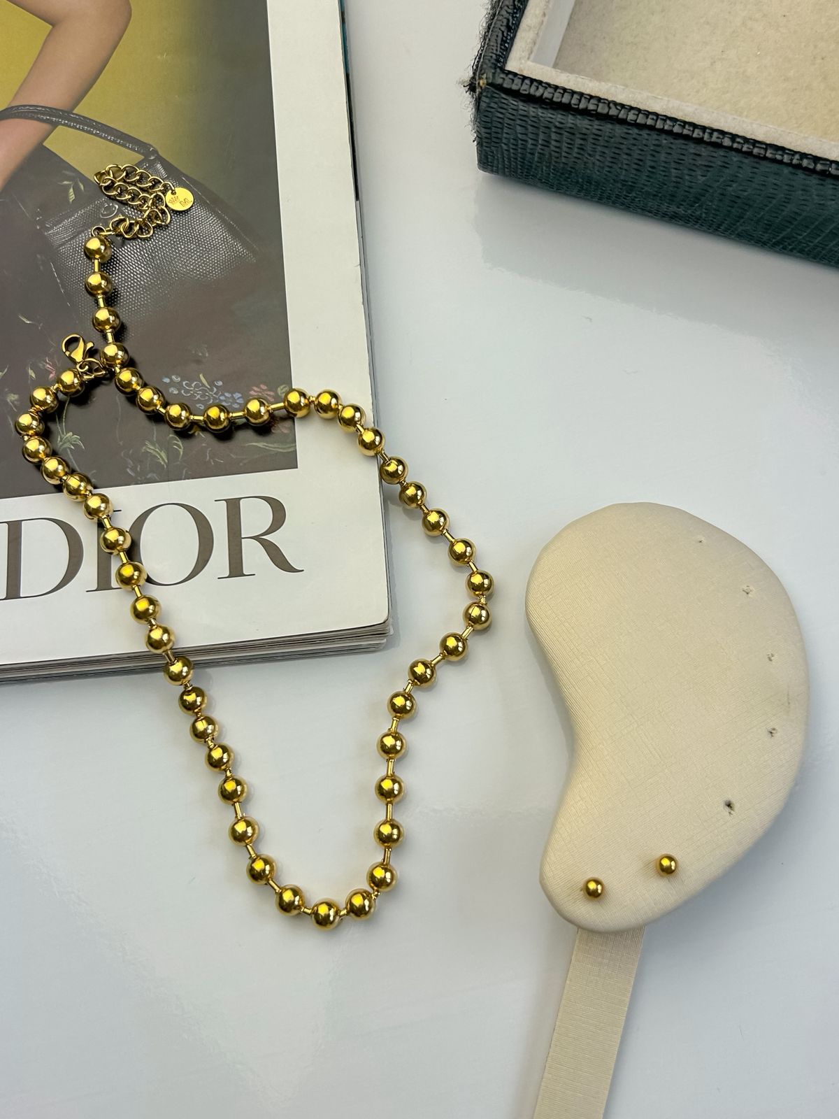 Conjunto de brinco e colar dourado com esferas em aço inoxidável.