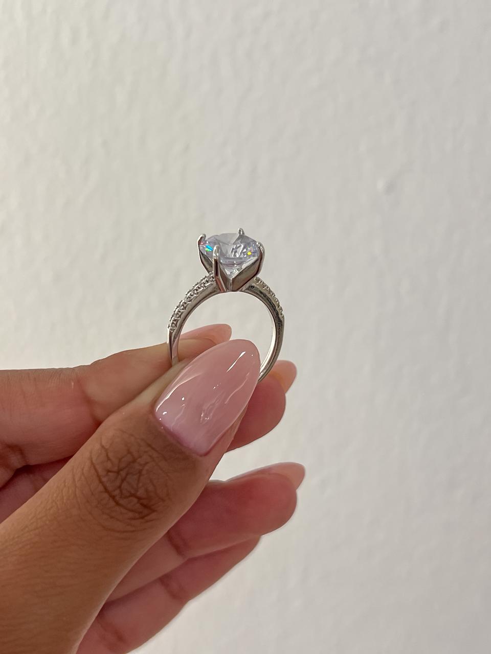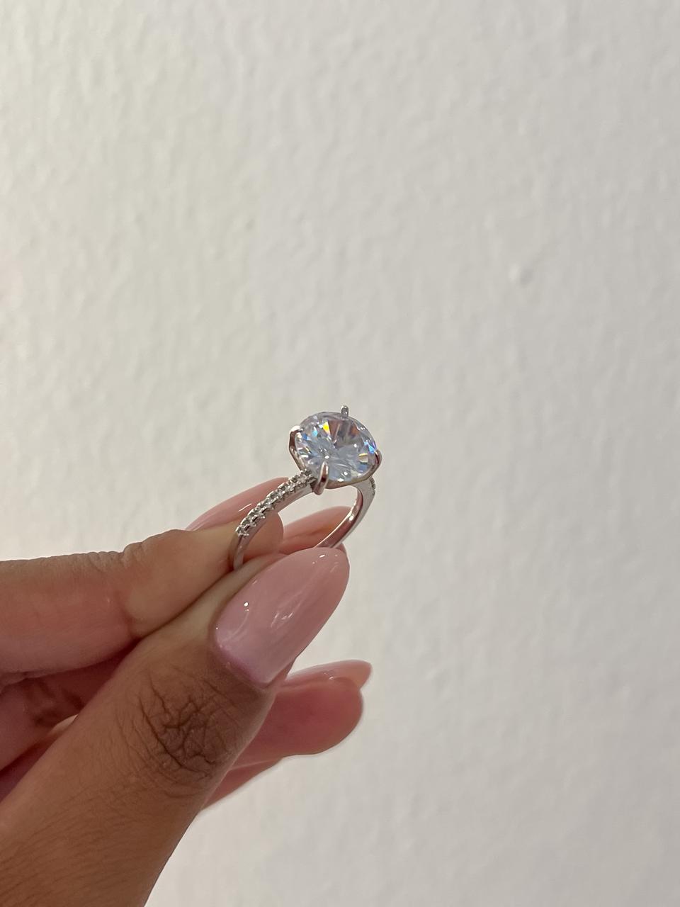 Anel solitário cravejado banhado em ouro branco;