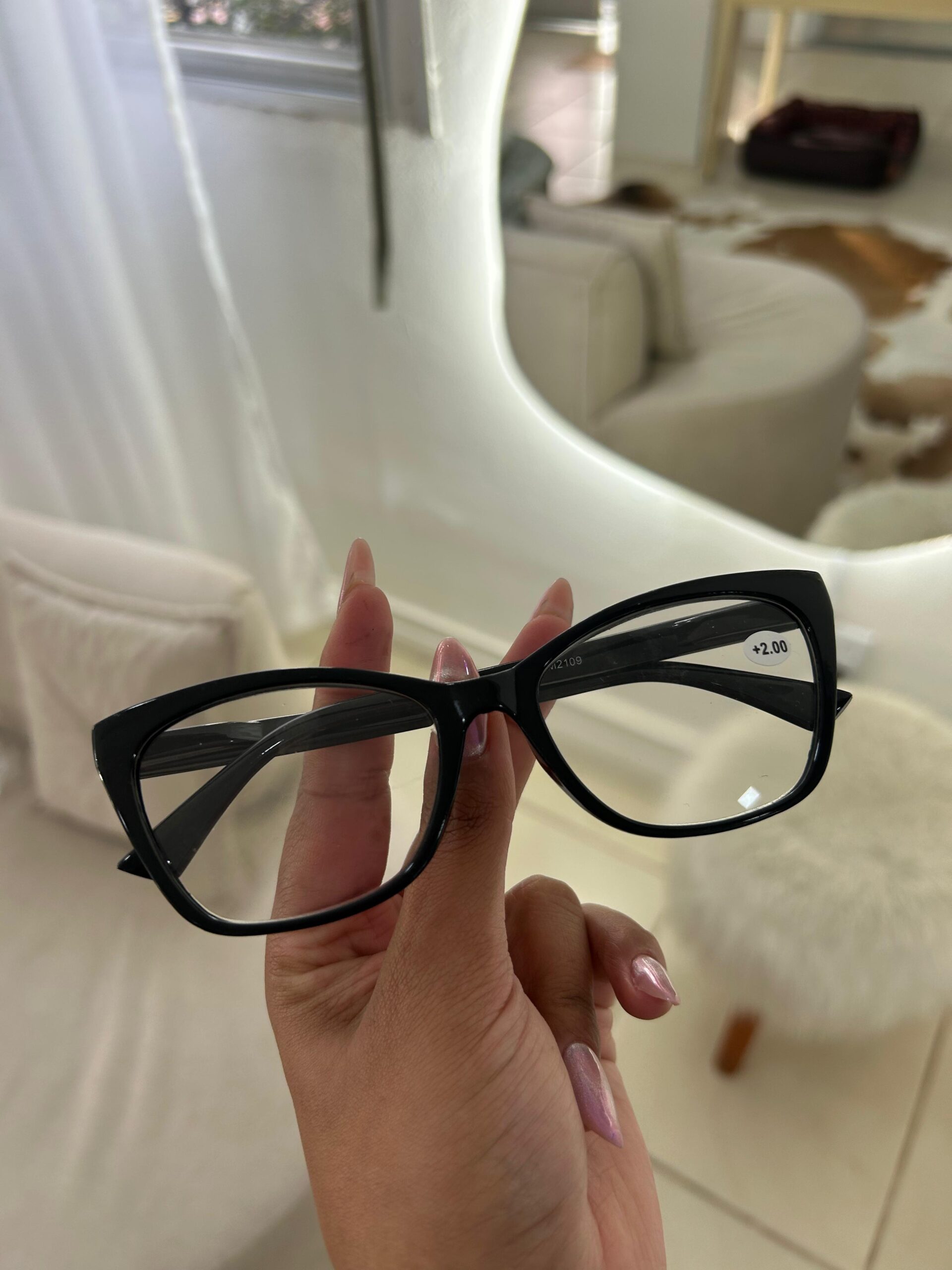 Armação de óculos com lente de grau 2.00, na cor preto formato gatinho.