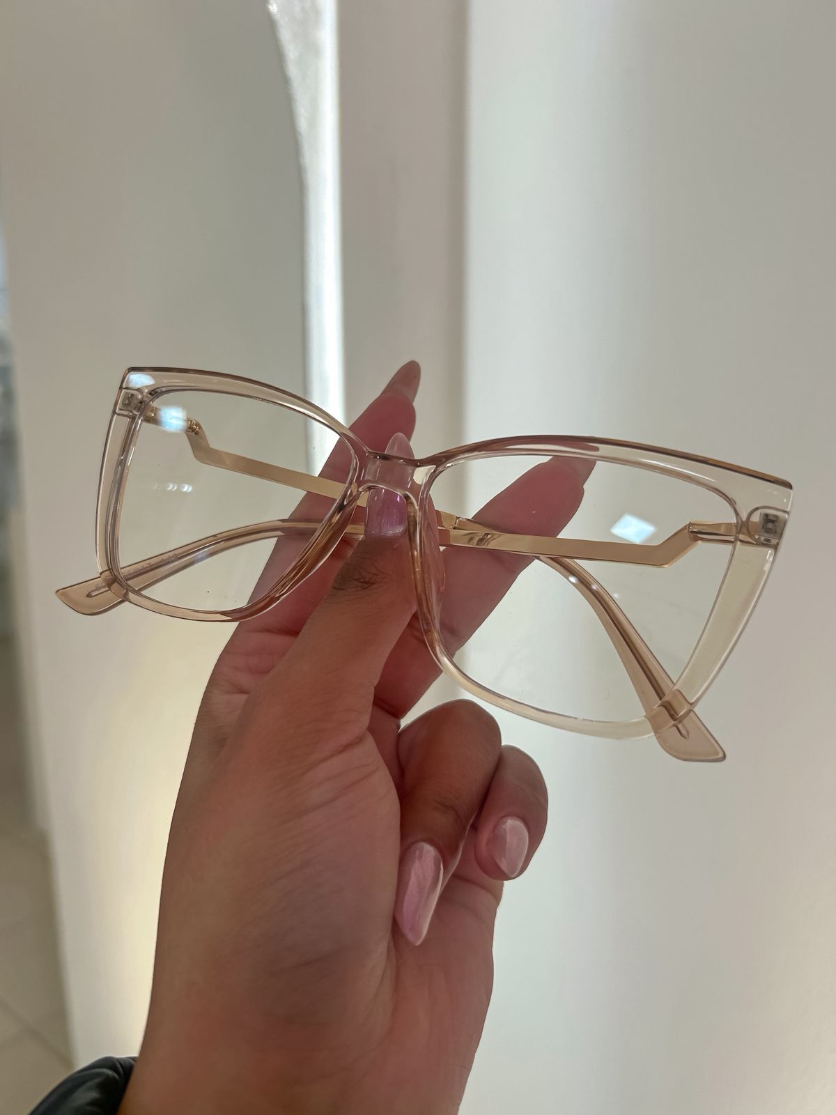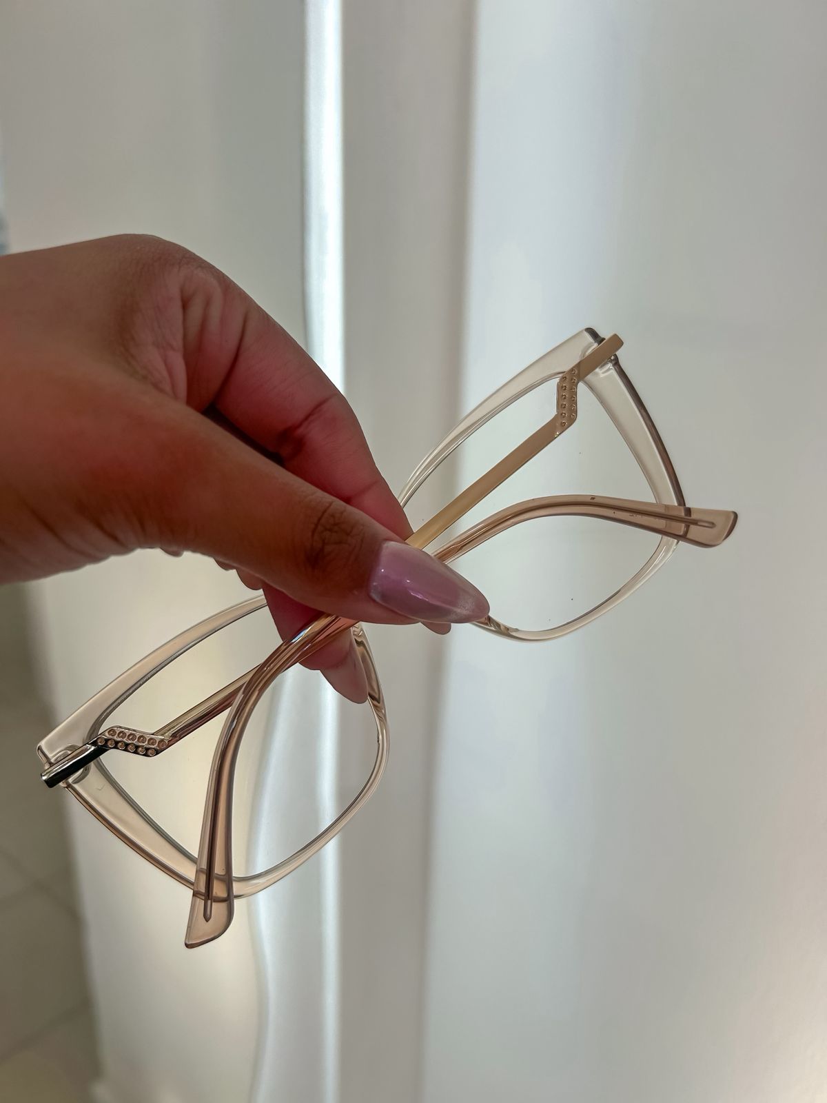 Armação de óculos no formato gatinho com detalhe em dourado no cabo e armação rose.