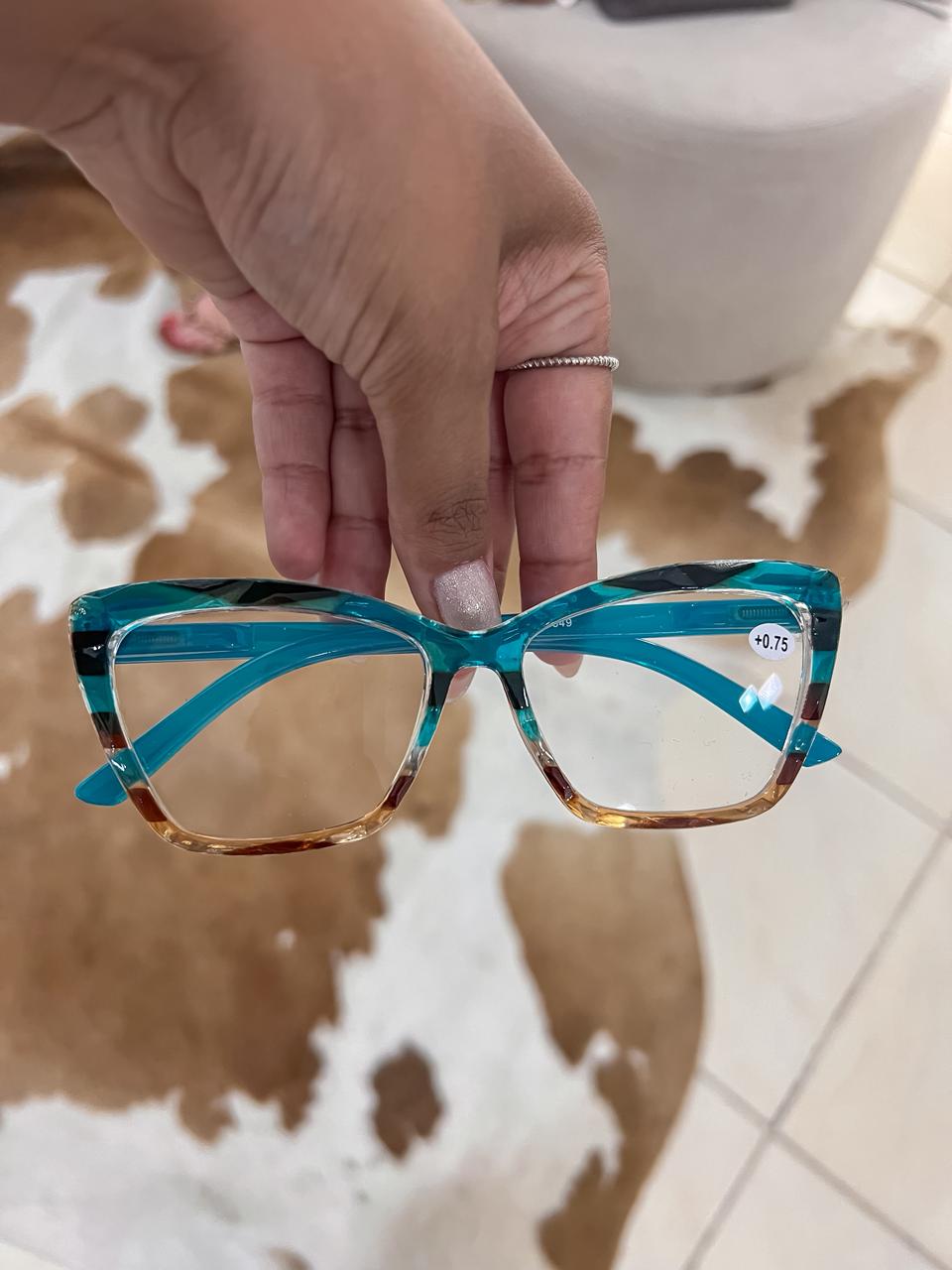 Armação de óculos com detalhes de azul com marrom;