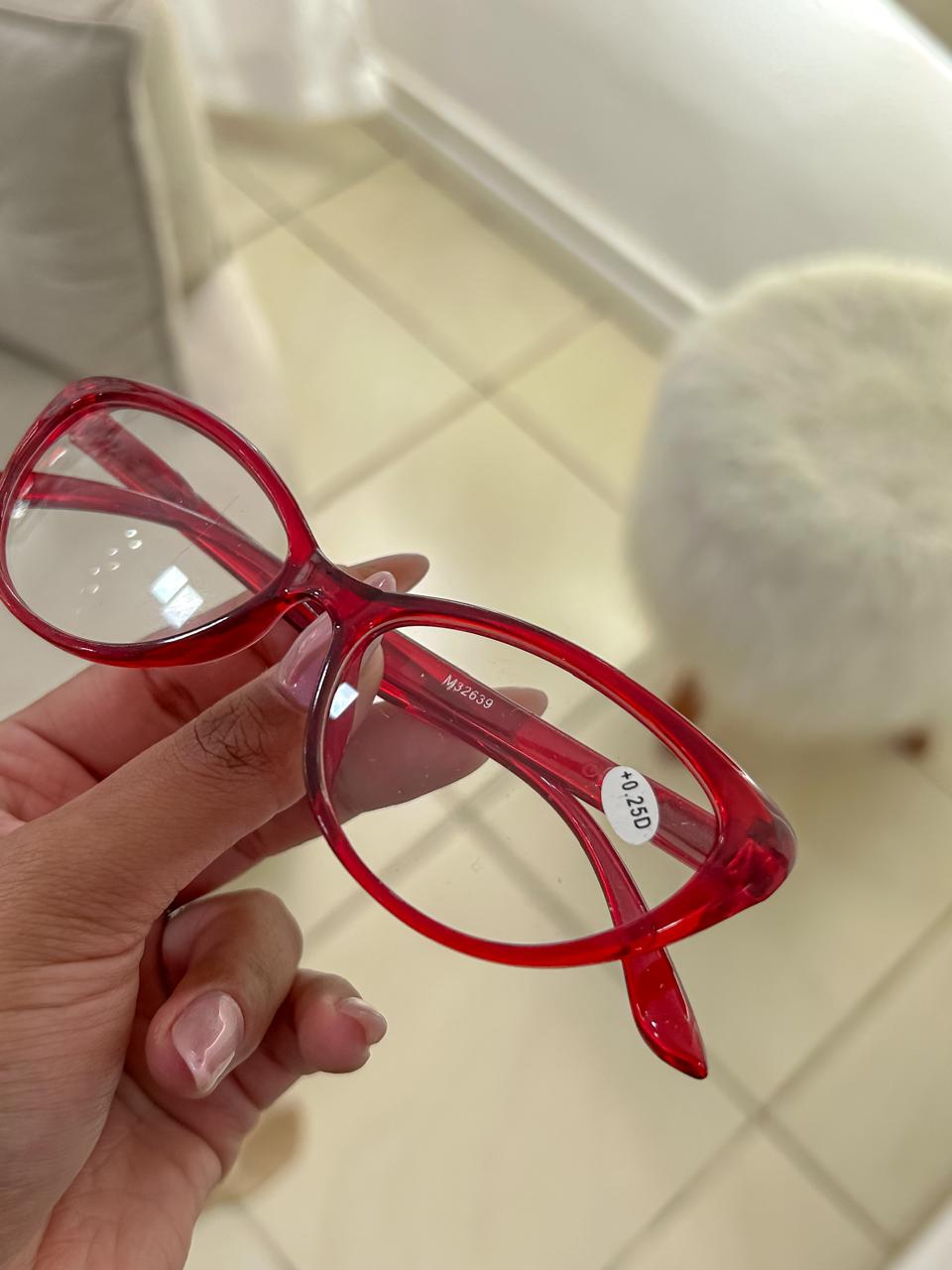 Armação de óculos com lente de grau 0.25, na cor vermelha.