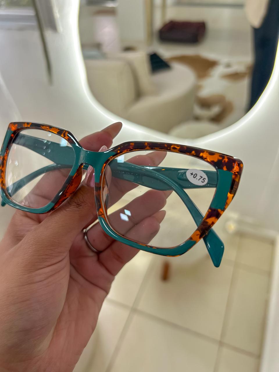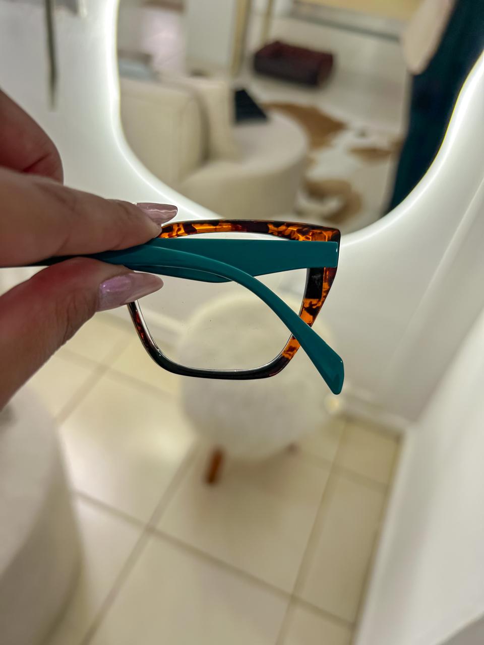 Armação de óculos com lente de grau 0.75, formato grande com estampa e na cor verde.