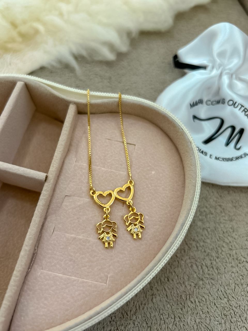 Colar filhas coração vazado com pingente de duas meninas banhado em ouro 18k, possui extensor.