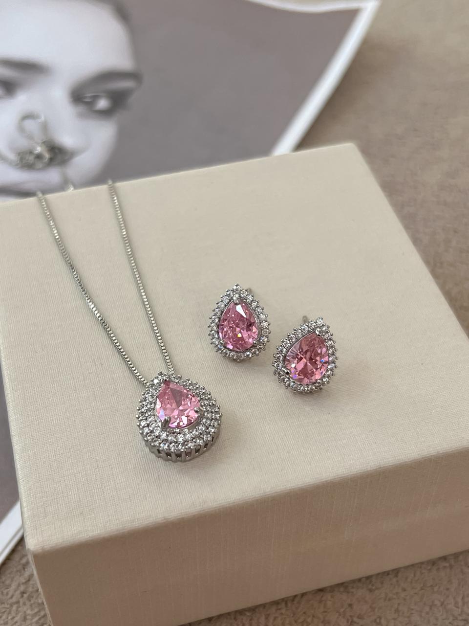 Conjunto coração cravejado quartzo rosa banhado em ouro branco;