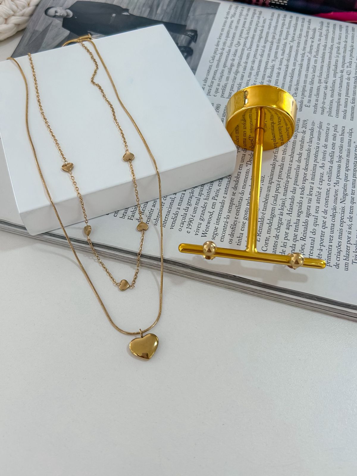 Conjunto de brinco esfera + colar de correntaria com pingente de coração com pérola em aço inoxidável no dourado.
