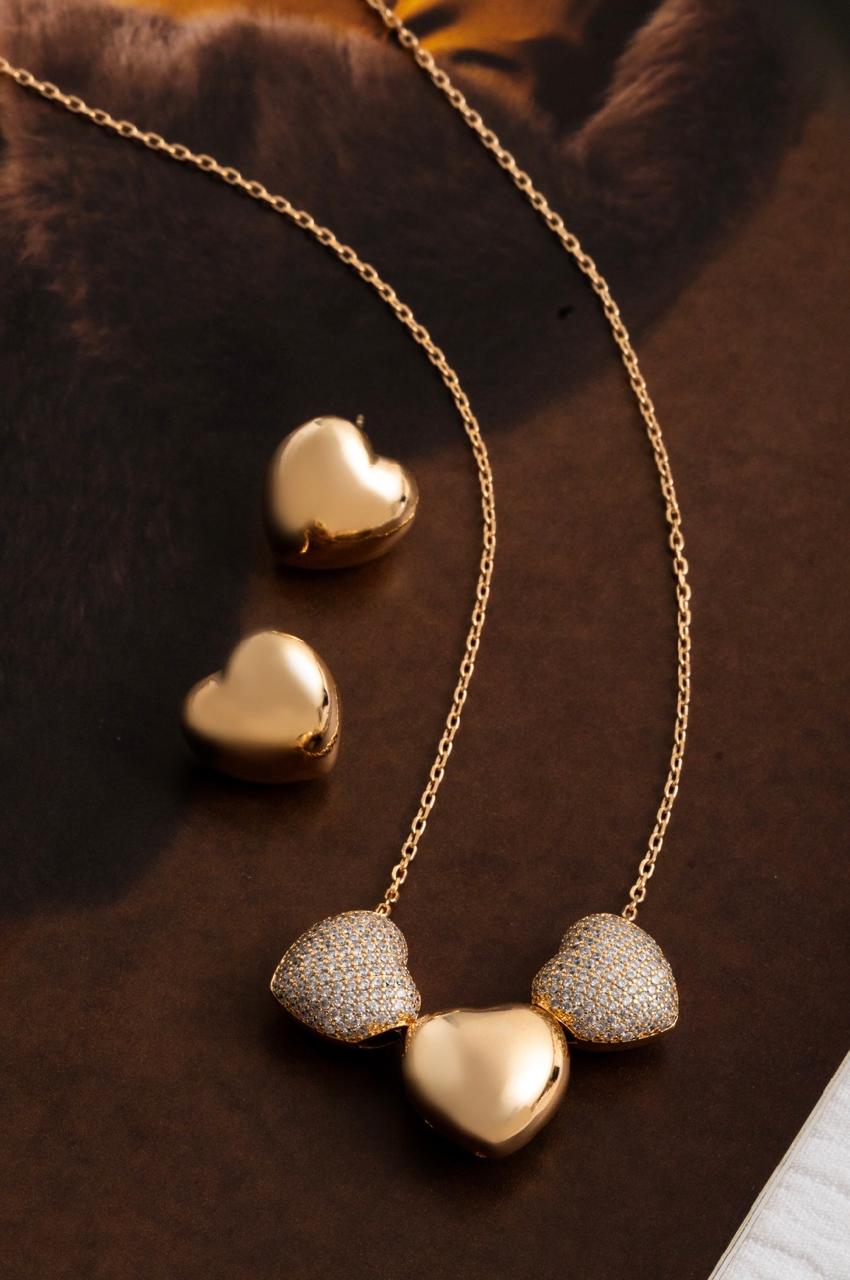 Conjunto coração de brinco + colar com detalhe cravejado banhado em ouro 18k;