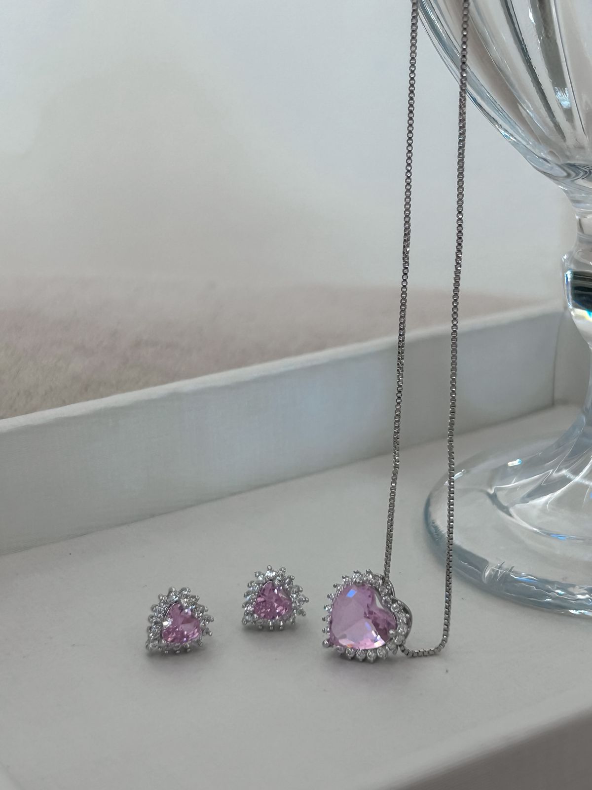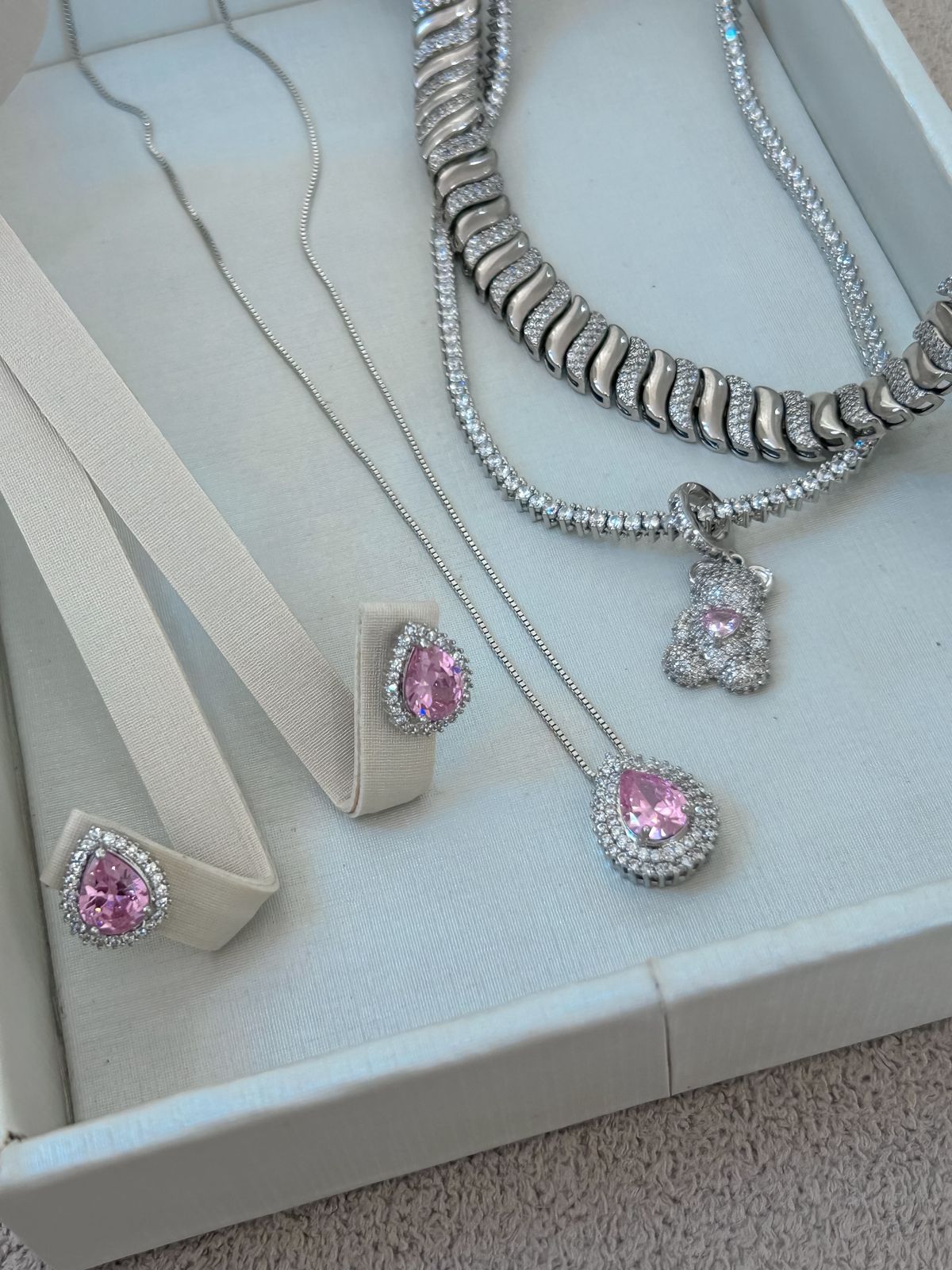 Conjunto gota rosa colar + brincos com pedras banhado em ouro branco;