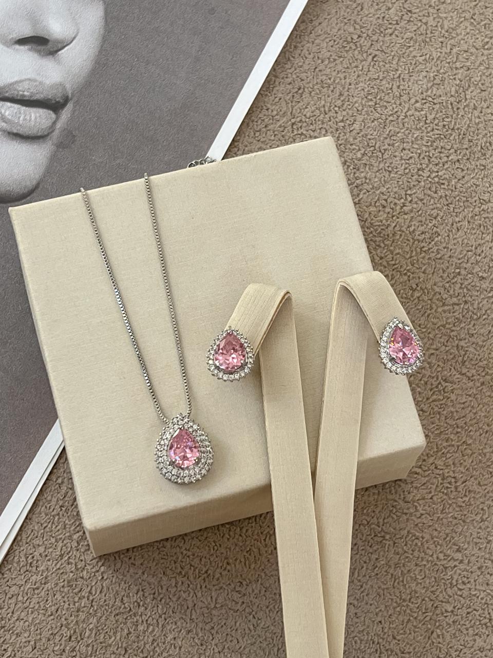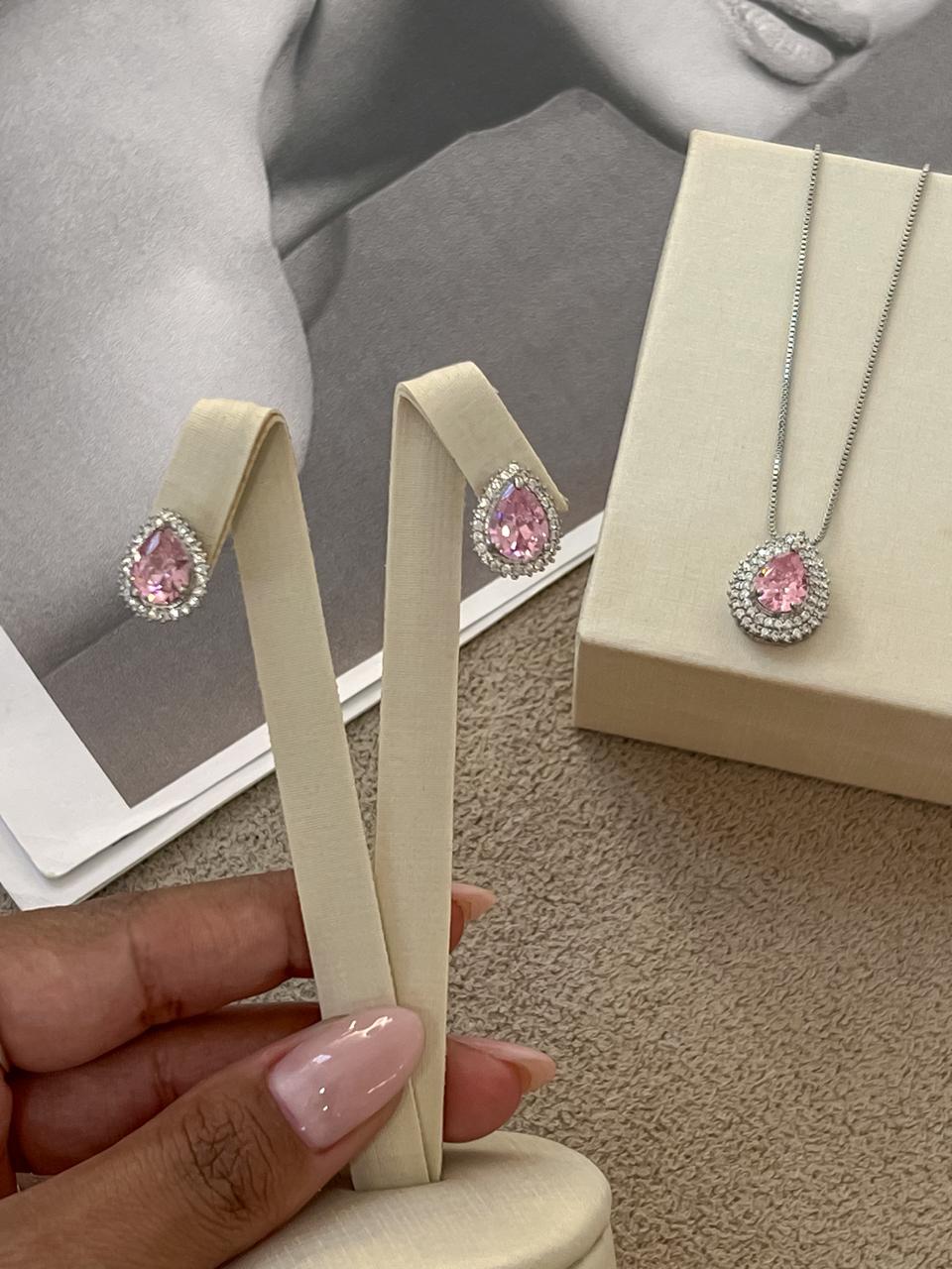 Conjunto gota cravejado banhado em ouro branco;