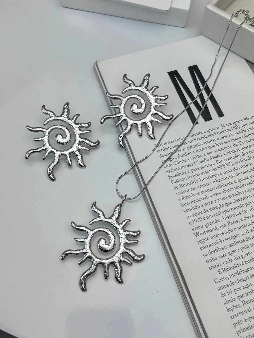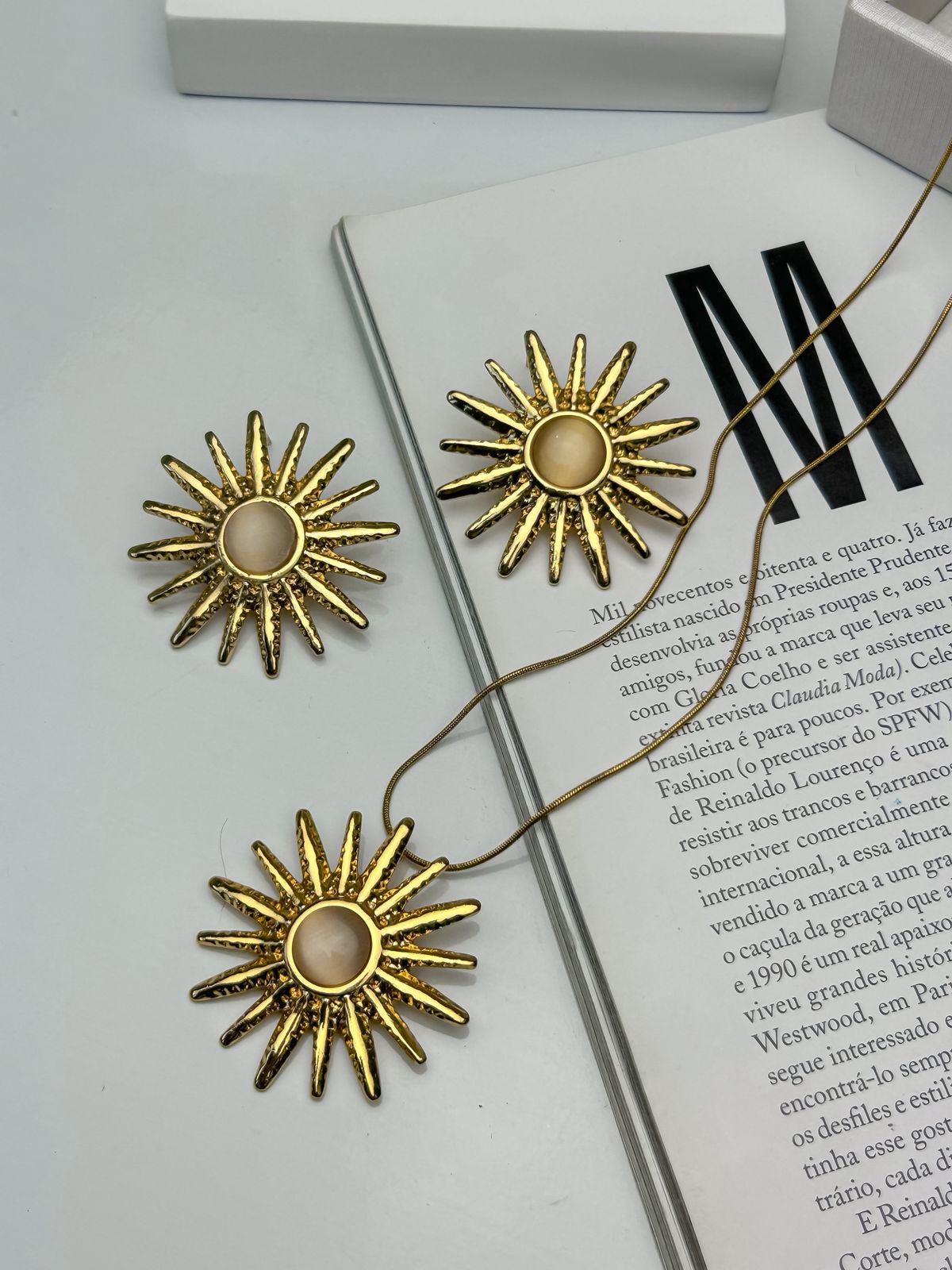 Conjunto sol colar + brincos banhado em ouro branco, aço inoxidável.