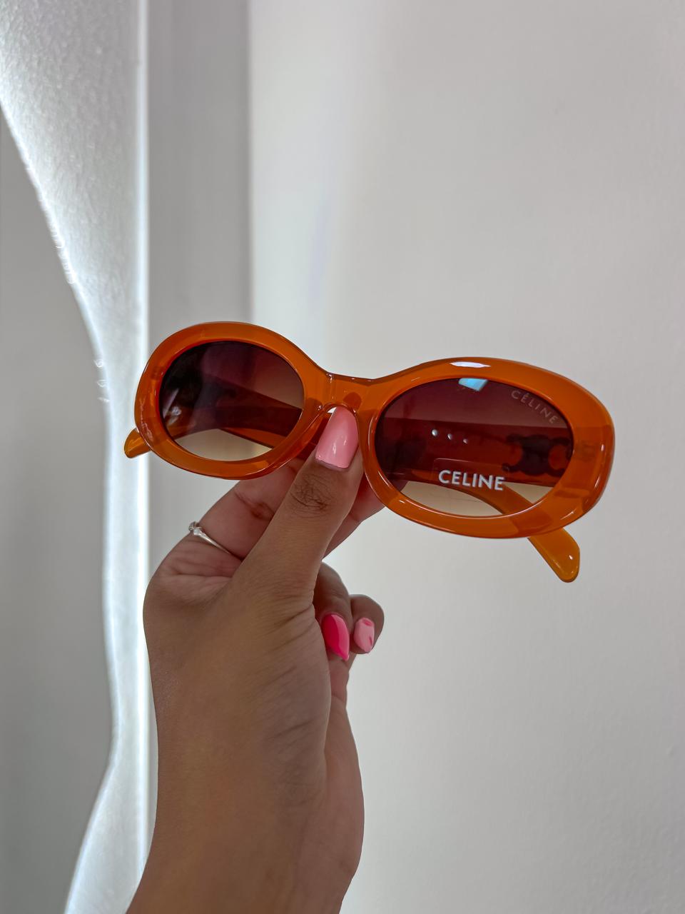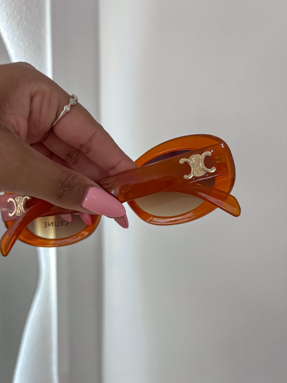 Óculos de sol inspiração Celine, com armação laranja e lente escura;