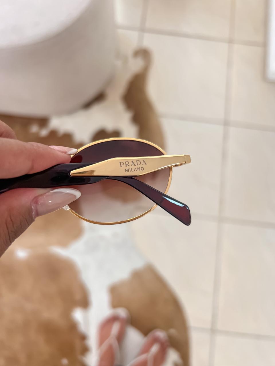 Óculos de sol inspiração prada, com armação dourada e lentes claras;