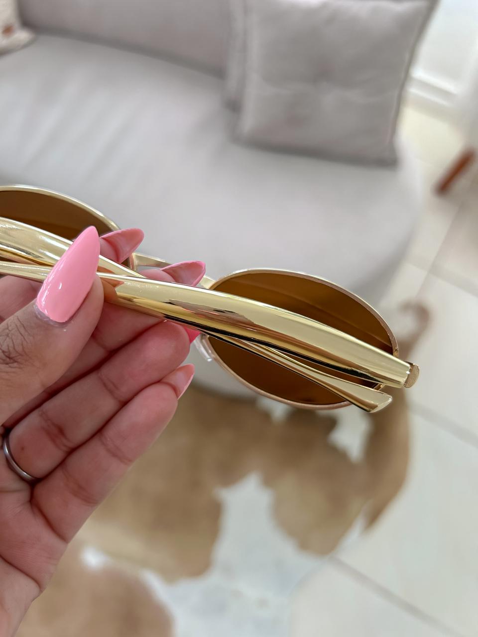 Óculos de sol inspiração Bottega veneta com armação dourada e lentes marrom;
