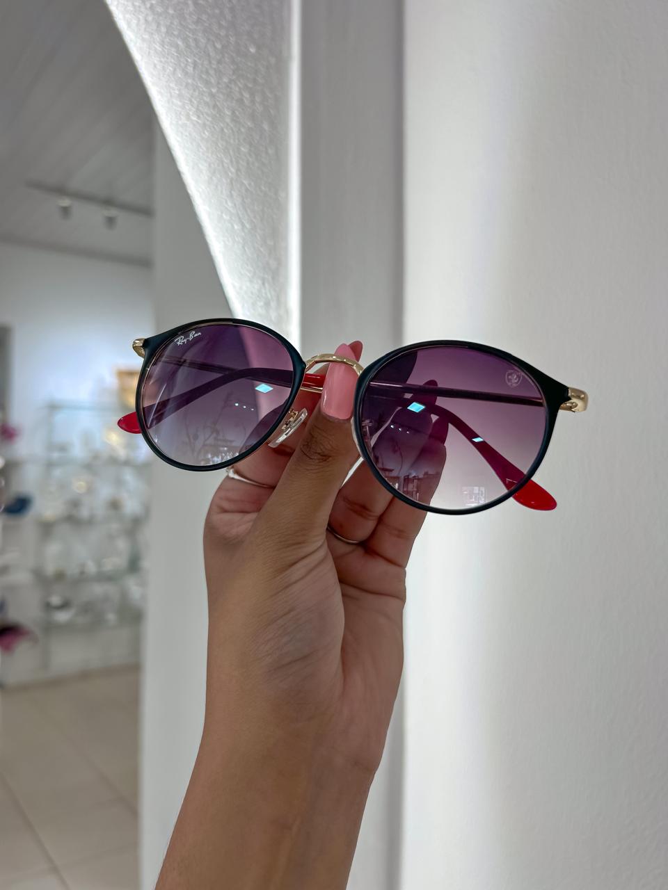Óculos de sol inspiração ray-ban com hastes dourado com vermelho e lentes preta;
