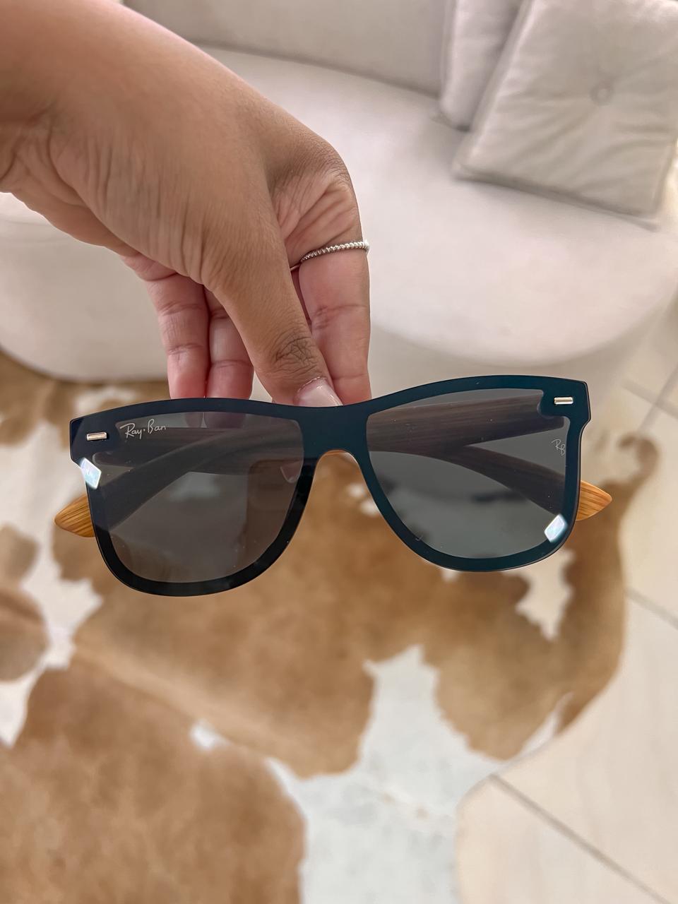 Óculos de sol inspiração ray-ban com armação marrom e lentes preta;